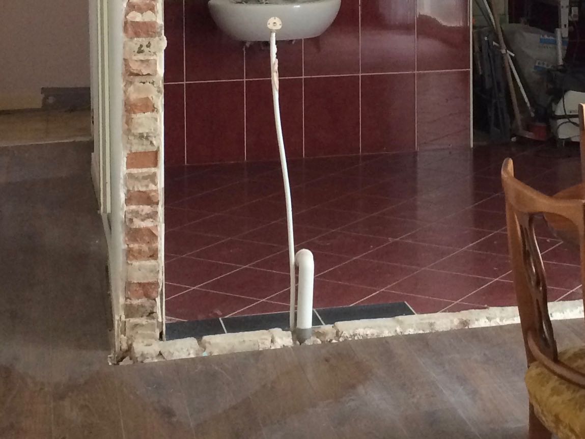 Nu de keukenmuren deels gesloopt zijn, komen er een hoop electra-, gas- en waterleidingen bloot te liggen.