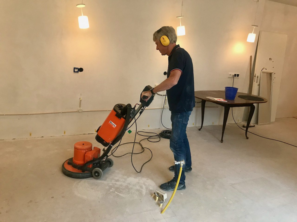 Om de tegellijm goed te laten hechten, moet de toplaag van onze anhydriet gietvloer opgeschuurd worden. In het begin zigzagden de machine en ik half dronken door de keuken, maar na een tijdje had ik het monster in bedwang. Het was binnen een uurtje klaar.