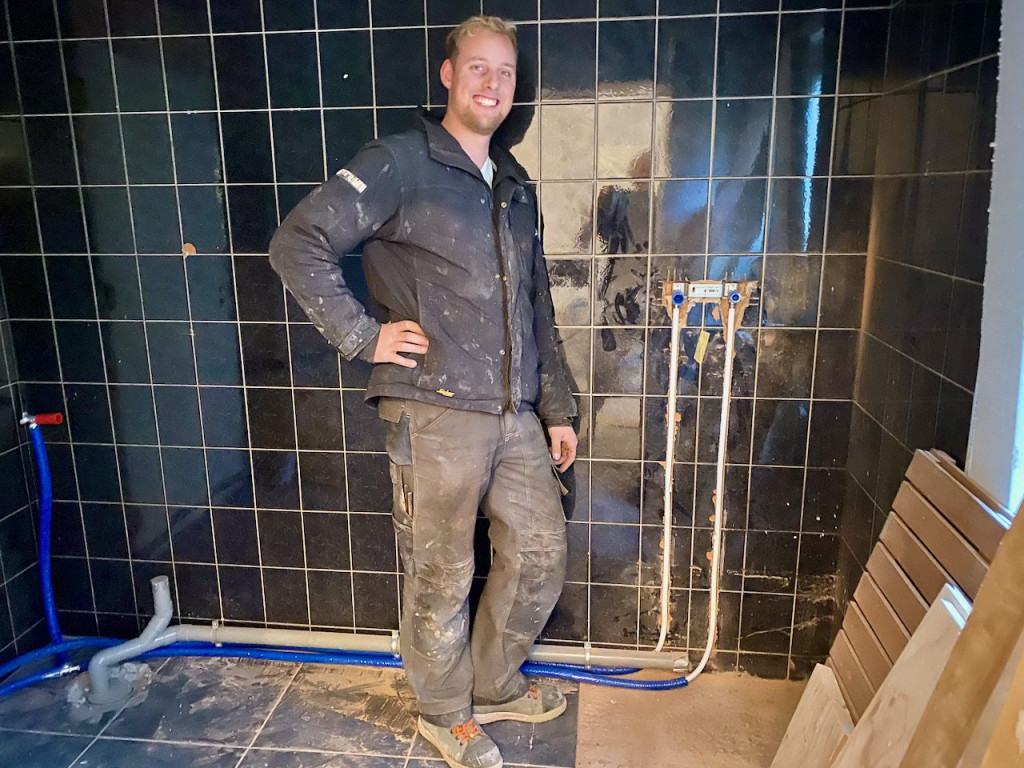 Bart had ondertussen een dagje in onze darkroom doorgebracht. Daar komen straks onze wasmachine en droger te staan en er komt een uitstort gootsteen met warm en koud water. Op een oud porno putdeksel heeft Bart de afvoer gemonteerd, hij heeft de waterleidingen aangelegd, en de leidingen voor de gootsteen in de muur ingeslepen.