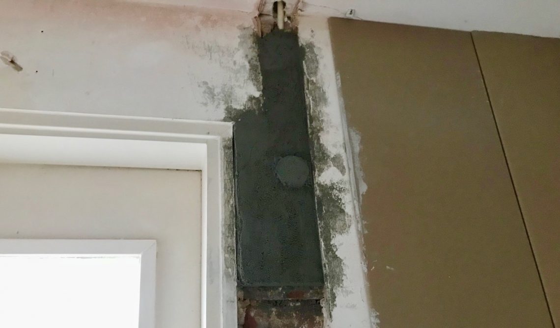 We zijn natuurlijk nog steeds in het trappenhuis. De houten constructies met gipsplaat zijn op een haar na af, maar de stenen achtermuur heeft nog wat aandacht nodig. Om te beginnen zat daar nog de rest van de balk die ik afgezaagd had, compleet met metalen muuranker.