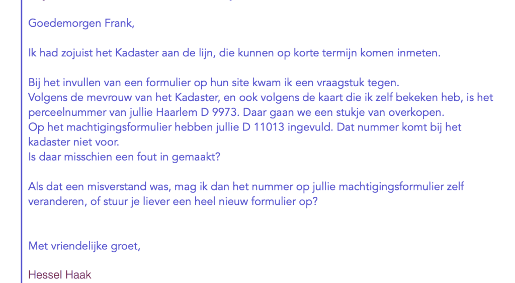 Ik denk dat je in principe, bijvoorbeeld in de Bijbel, overal waar het woord “hel” staat dit zou kunnen vervangen (met de zoek/vervangfunctie) door “Ymere”. Als Hessel zegt “O, er is weer een mail van Ymere” voelt het als een langdurige elektrische schok, vooral omdat ik weet dat hij er helemaal crazy van wordt. Ik werk nu tijdelijk voor een groot consultancy bedrijf, maar Ymere.. die kunnen er echt wat van. Wij zagen het al weer voor ons dat wederom een nieuwe vergadering zou worden uitgeroepen ad 350,- excl. btw en die dan pas in februari 2022 zou kunnen plaatsvinden. Gelukkig is dat nog niet het geval. Ymere stuurde na ontvangst van de voorlopige tekening die Hessel uiteindelijk zelf maar gemaakt had de documenten toe… met het verkeerde kadasternummer.