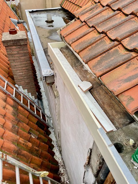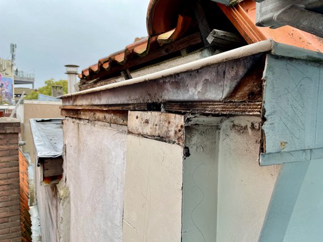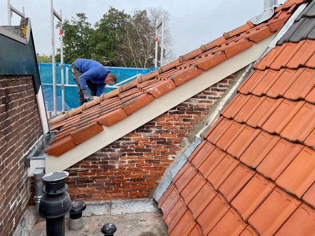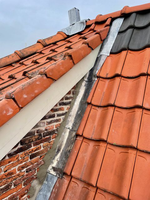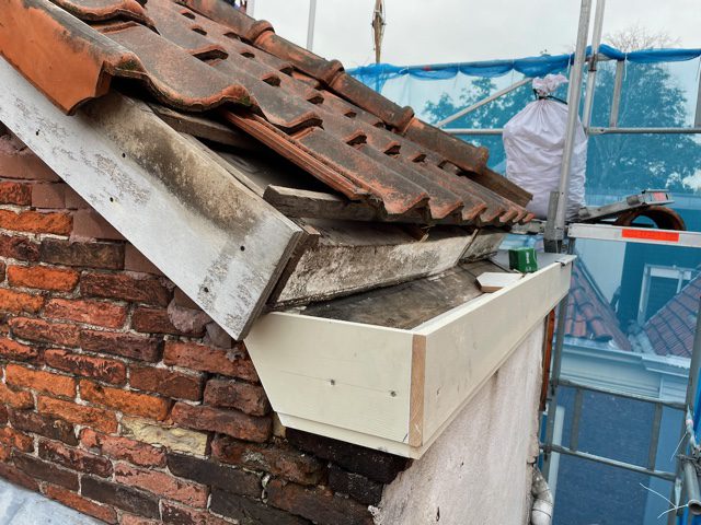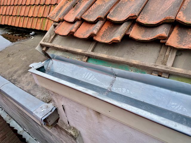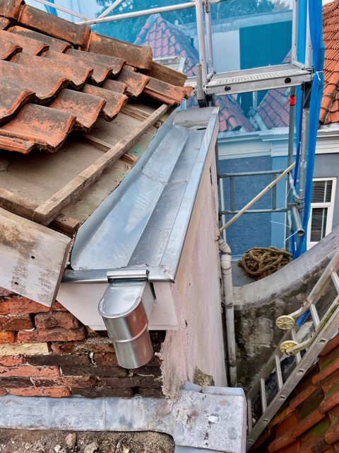 Nu gaan we, vanaf de straat gezien naar links. De goot die daar aan de zijkant zat, was helemaal verrot. Er is een nieuwe houtconstructie gemaakt en met zink afgewerkt.