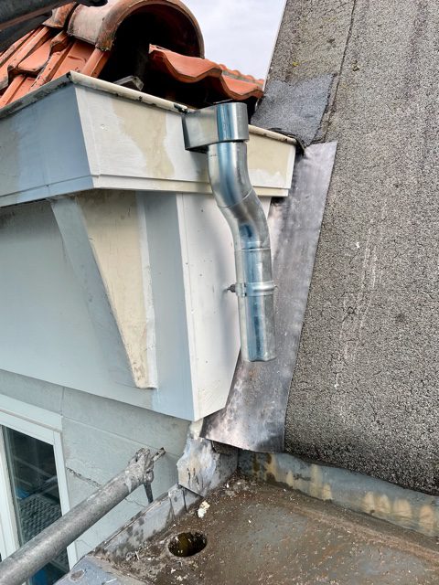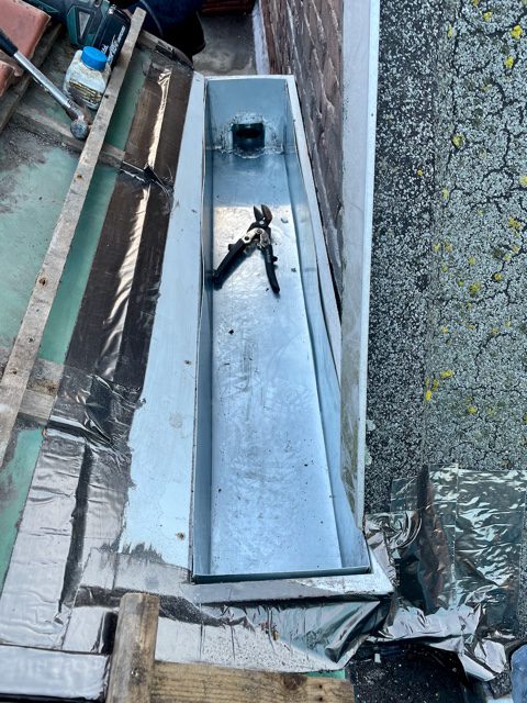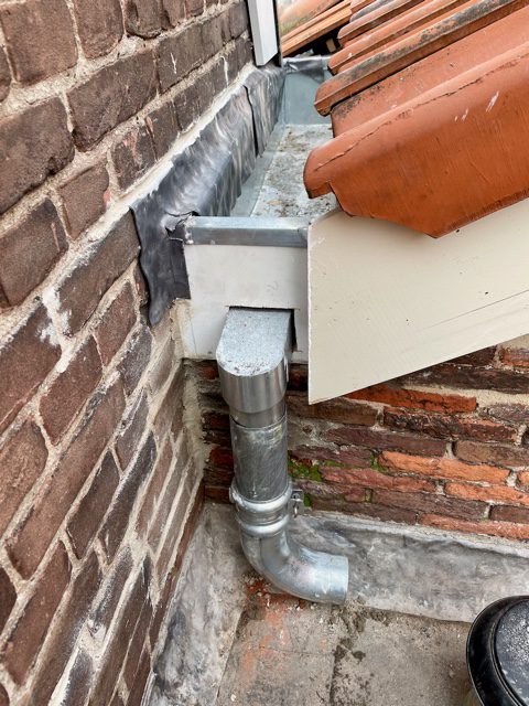 Nog steeds vanaf de straat rechts, maar nu aan de voorkant, zat ook een malle goot. Daarvan is het houtwerk vervangen en door Ron in het zink gezet. Ook hier is een nieuwe afvoer.