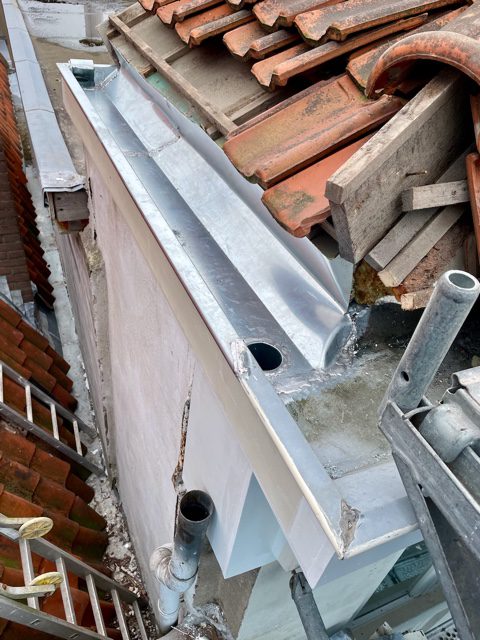 Die zinken bak is verder helemaal afgewerkt met nog meer zink, en er is een nieuwe loodslab geplaatst. De bak heeft een nette uitloop gekregen. Ook zijn alle bakstenen afgevoegd.