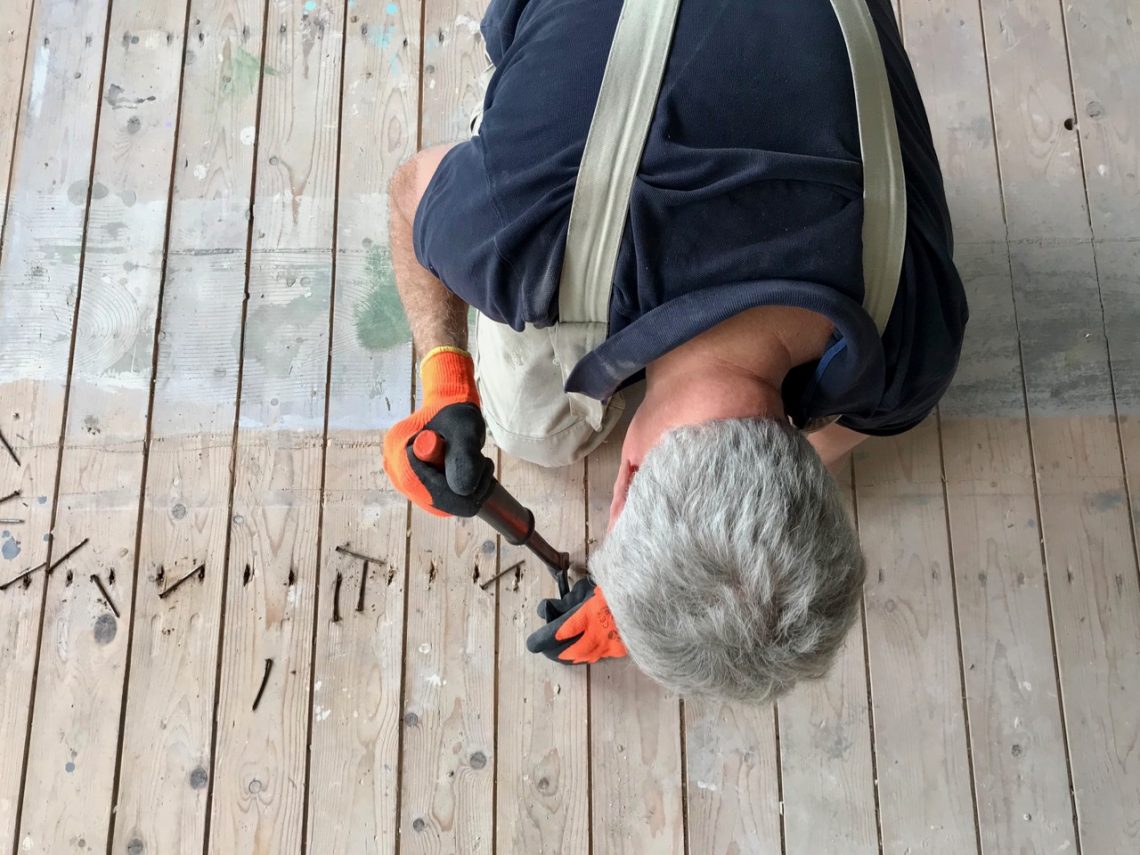Eerst moesten de spijkers er uit. Ik liep beneden ‘het rode stof te bestrijden’ en hoorde Hessel boven steeds zuchten. Het is een monnikenwerk. Omdat je er niet heel erg intelligent voor leek te moeten zijn, vroeg ik of ik het niet kon doen. Echter, je moet zoveel kracht zetten om de spijkers uit de vloer te trekken met de spijkertrekker dat ik dat niet zou kunnen. Daar zit wat in.