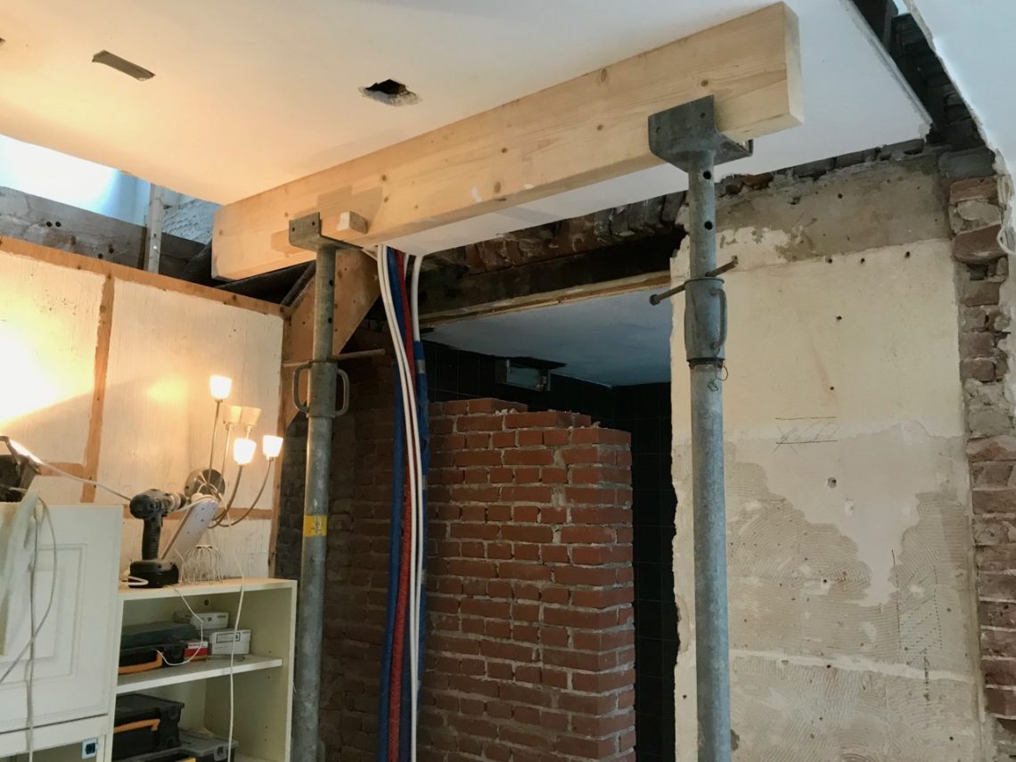 Samen hebben we de constructielpoten neergezet. Hessel zaagde heel dapper de laatste rest van de oude deurpost door, haalde de steunblokken hout weg, en ja hoor, de slaapkamermuur bleef netjes boven ons hoofd zweven.