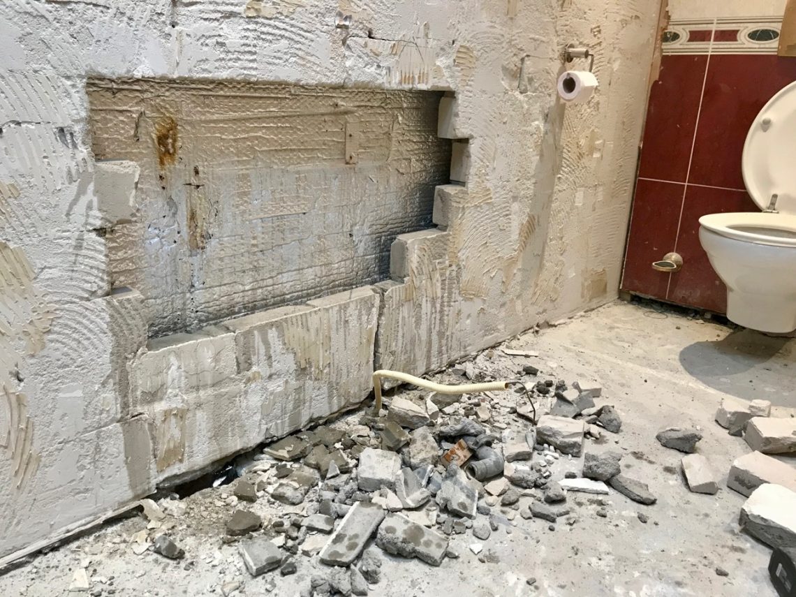 Het eerstvolgende grote project in huis is de badkamer. De vloer is nu kaalgebikt en de plaats van het sanitair is bij benadering bepaald. Het enige ongewisse is de muur die zo dapper afgebikt is door de Polen. Hij moet…