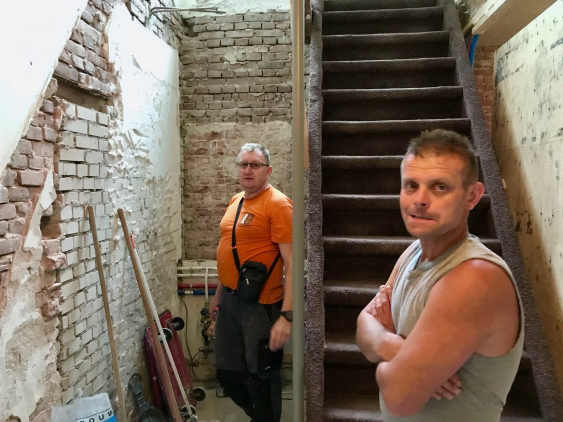 Er moest nog flink veel voorbereid worden voordat ze konden beginnen. Het oude stucwerk moest er helemaal af, er staken hier en daar nog ongebruikte waterleidingen uit de muur en er zaten overal gaten die dichtgemetseld moesten worden. Dat waren nou typisch wel klusjes voor mij.