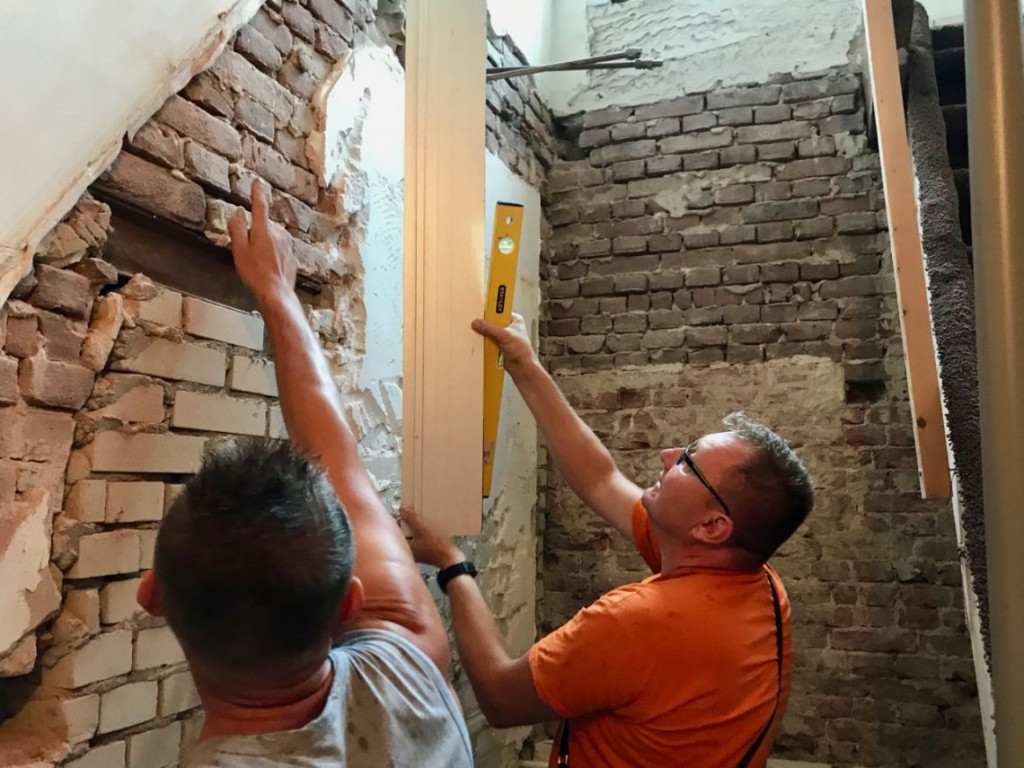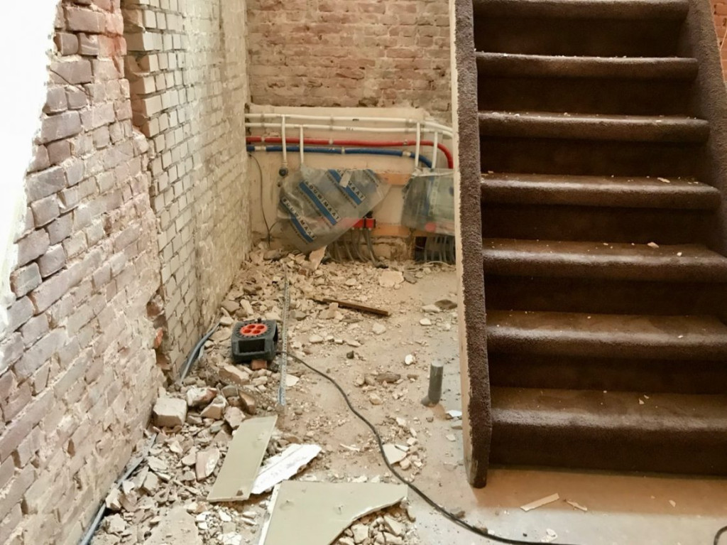 Er moest nog flink veel voorbereid worden voordat ze konden beginnen. Het oude stucwerk moest er helemaal af, er staken hier en daar nog ongebruikte waterleidingen uit de muur en er zaten overal gaten die dichtgemetseld moesten worden. Dat waren nou typisch wel klusjes voor mij.