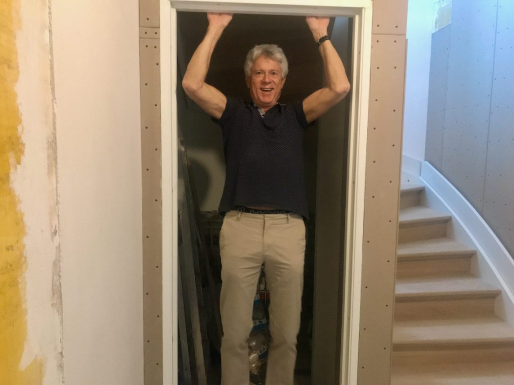 Binnengekomen overvalt me altijd het gevoel dat het allemaal al lijkt alsof het altijd al zo was. De plafond-lijsten zijn zo perfect en met aandacht gerepareerd, dat het helemaal niet opvalt dat ze er 2 weken geleden nog niet waren. Hetzelfde geldt voor de muren. Heel jammer eigenlijk voor Hessel. De trapkast viel me wel meteen op, en Hessel liet ook even zien hij sterk hij was (wist ik al) en de trapkast zelf is net zo sterk.