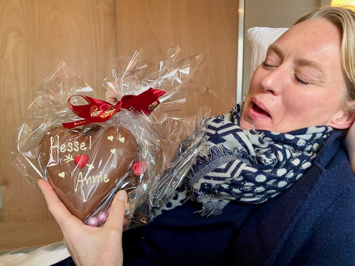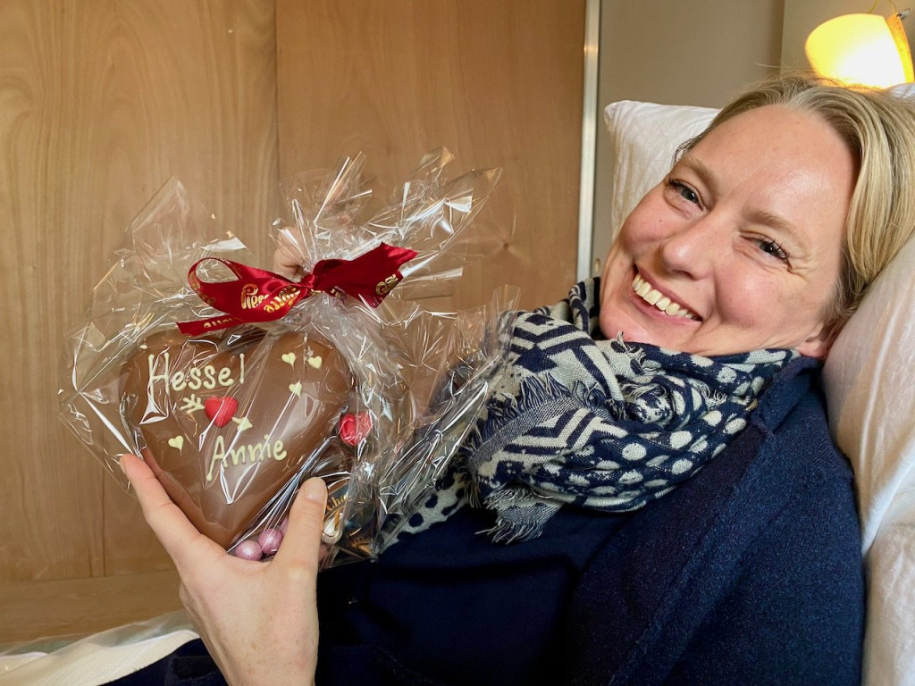 Hessel en ik gingen natuurlijk ook het bed testen qua voeteneinde omhoog en omlaag. Hij vond dat ik eens moest kijken hoe hoog de bovenkant kon. Opeens zag hij onder het bed een gevuld chocolade hart met opschrift liggen..
