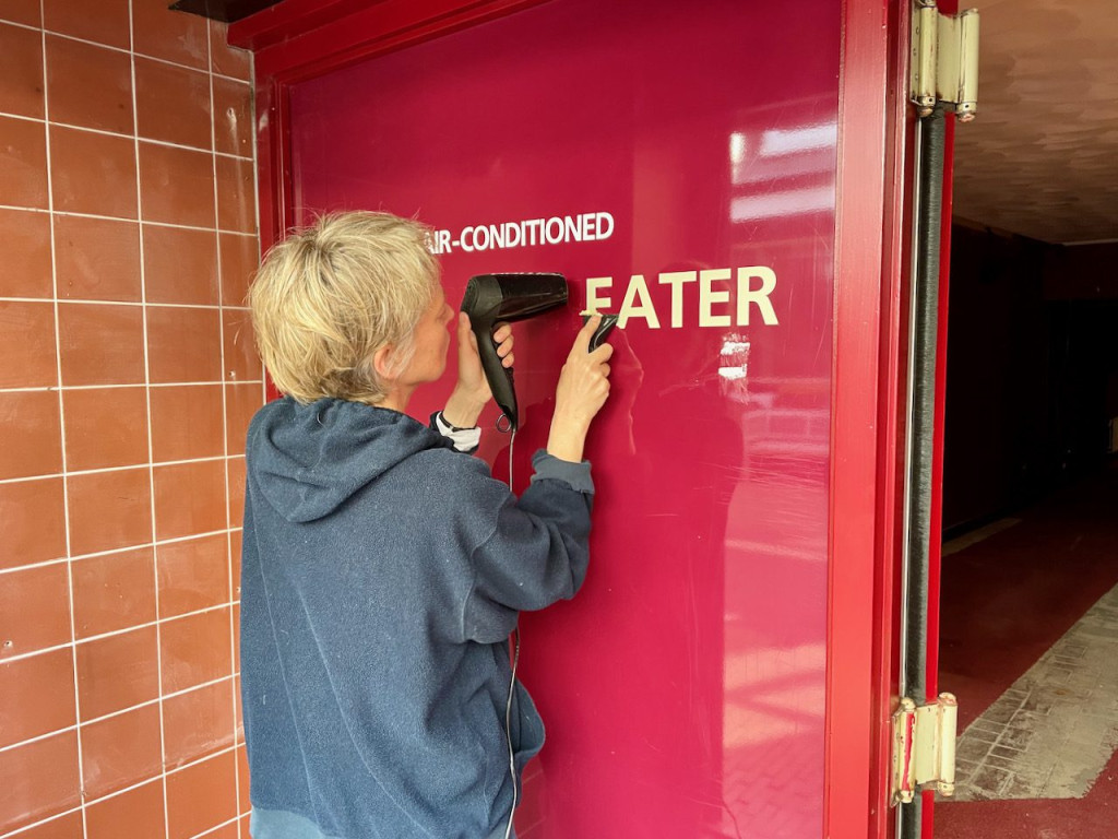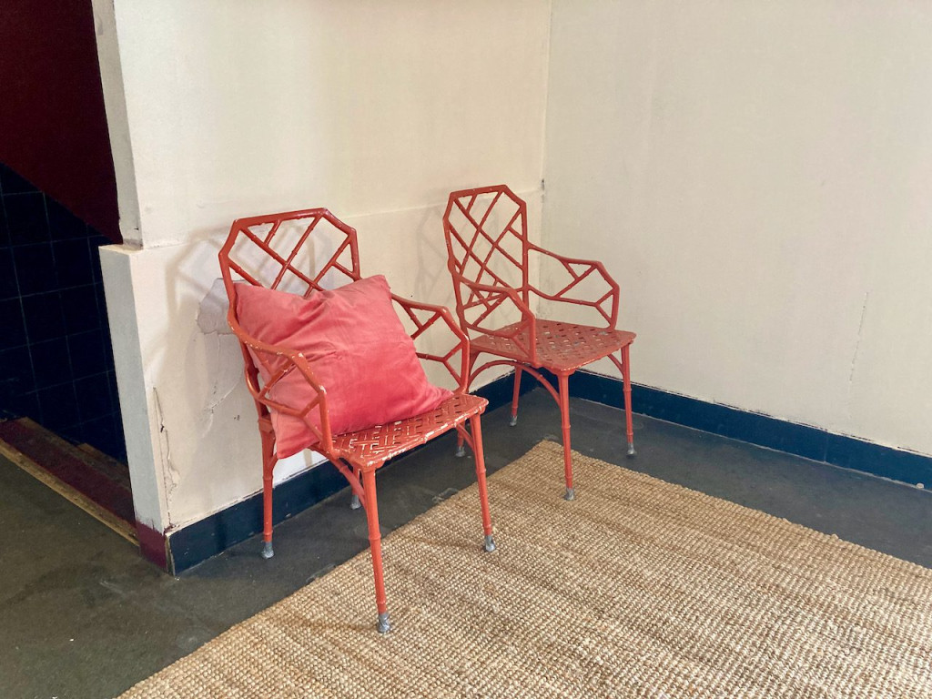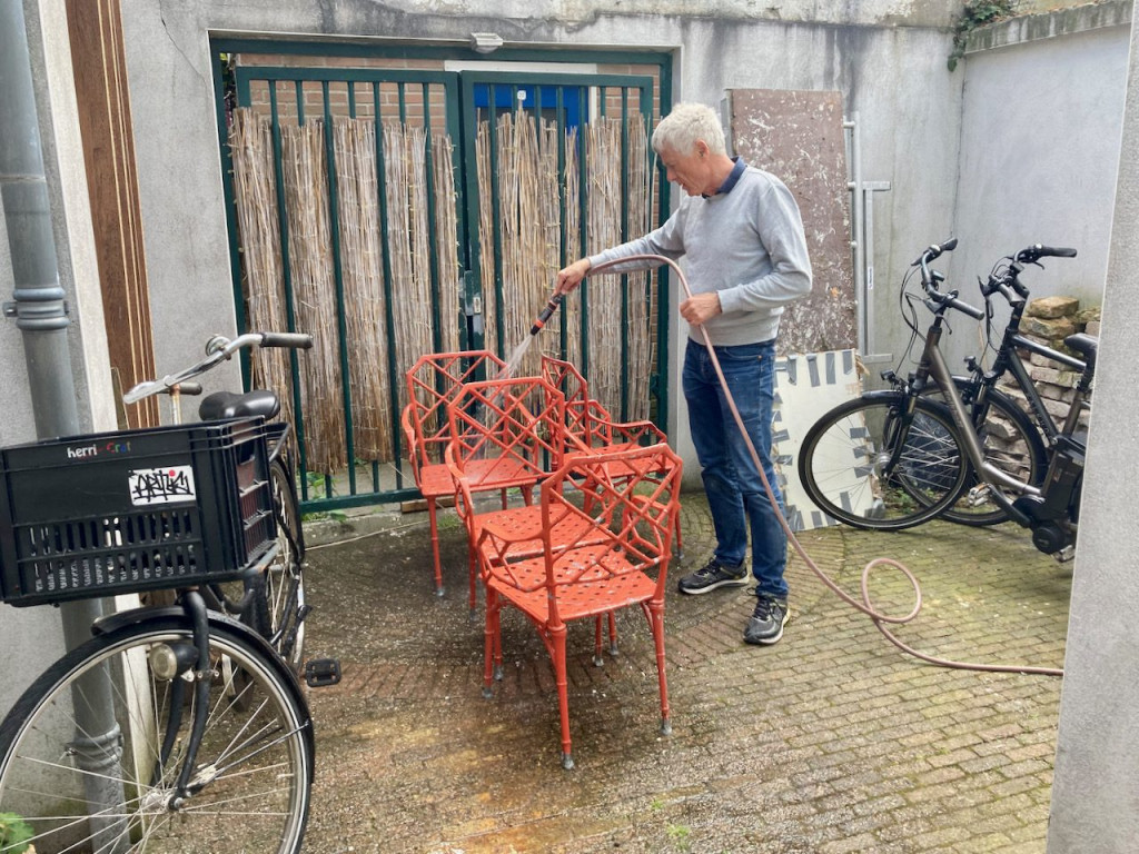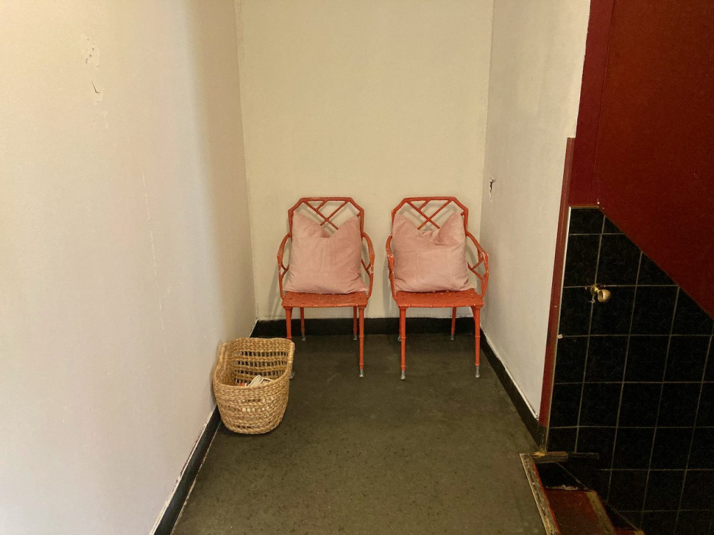 De rode stoeltjes die nog op zolder lagen (binnenkort te koop op Marktplaats) even schoonspuiten, want die doen vanaf nu dienst als “accessoires”. Hier en daar ziet u als u inzoomt nog gaten en deuken in de muur van enthousiaste oud-klanten. Een stoeltje er voor doet veel.
