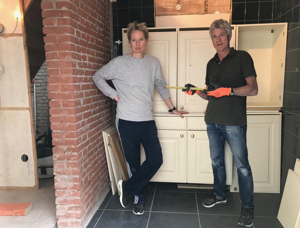 Vervolgens haalden we alle spullen uit de kast die tegen ‘de muur’ in de keuken stond en verwijderden de kastgedeelten die we niet meer nodig hadden. Het was goed om alles weer eens uit te sorteren en schoon te maken en rommel weg te gooien, evenals keukenkastjes die we zeker niet gaan gebruiken.