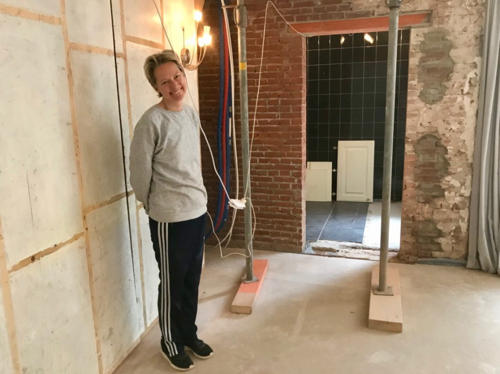Volgende week gaat het plafond uit de keuken. Dus alle spullen die onder dat plafond staan, moeten weggehaald worden. De afgelopen periode had Hessel tegen de nepmuur naast de trap een gereedschapskast opgebouwd uit oude keukenkastjes. Nu we de waskamer hebben kunnen we alle gereedschappen daar voortaan opbergen.