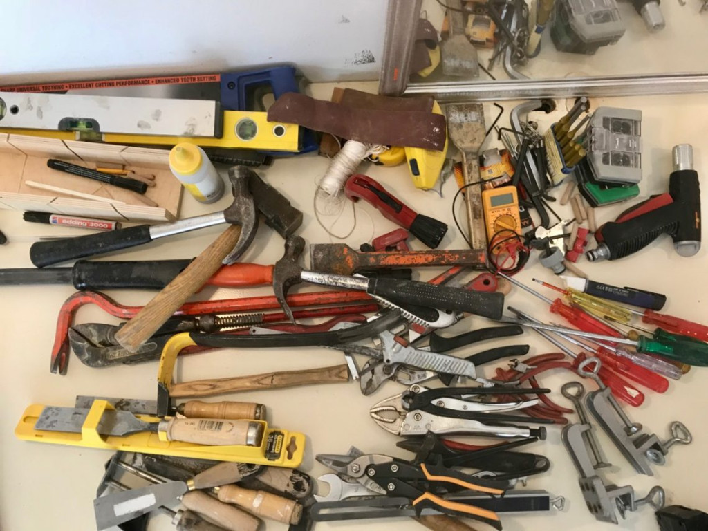 Toen we weer thuis waren was de volgende klus: het verplaatsen van alle gereedschappen die in de “kast” in de keuken stonden, naar een nieuw te monteren “kast” in de “waskamer”.