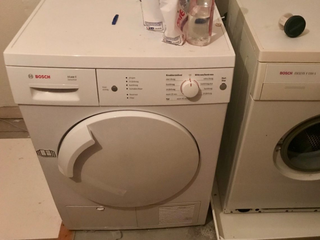 Hij staat hier naast de droger op de foto. Deze foto maakte ik voor Hessel om te bepalen aan welke kant het deurtje van de nieuwe machine (die we sowieso gingen aanschaffen voor het huis in Haarlem) moet zitten. Dinsdag wordt een nieuwe Bosch geleverd. Zo zijn we dan ook wel weer.