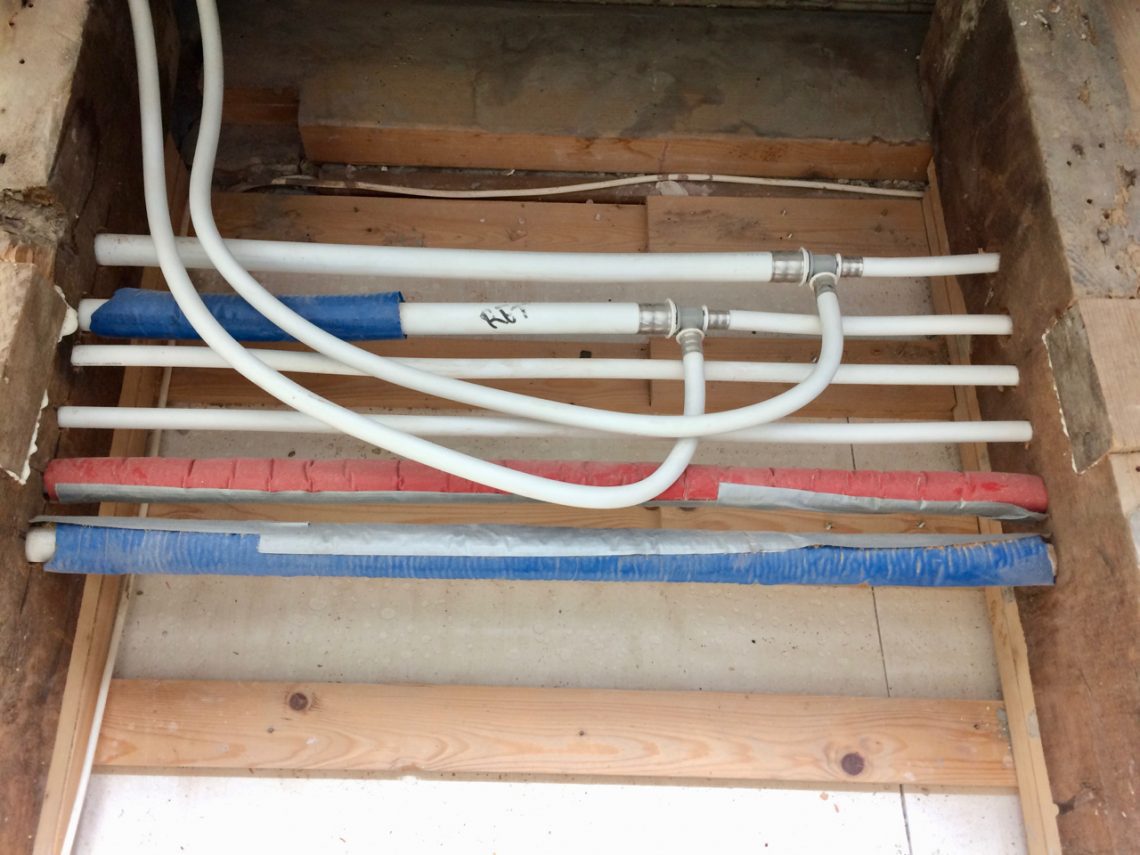 Er was nog een klein klusje te doen voordat het zover was. De water- en CV leidingen moesten nog geïsoleerd worden. Dat was een lollig werkje. Met een schuimrubber isolatiejasje liggen de leidingen nu klaar voor warm en koud water, zonder dat we daarmee ongewenst de ruimte tussen het plafond en de vloer aan het warmstoken zijn.