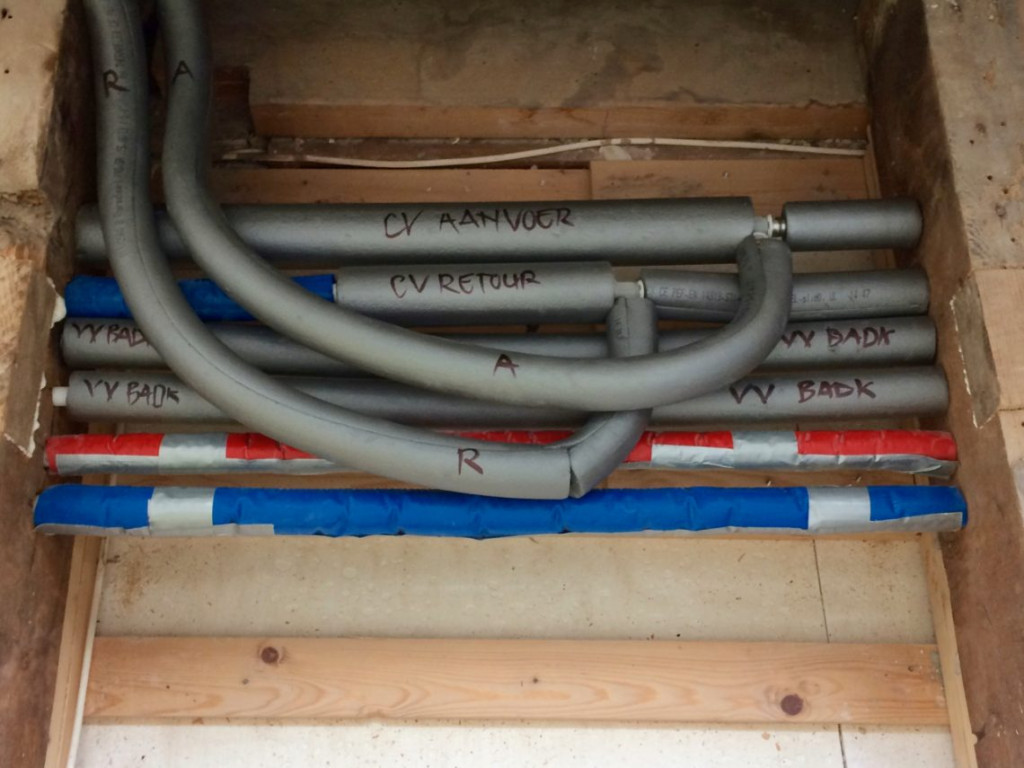 Er was nog een klein klusje te doen voordat het zover was. De water- en CV leidingen moesten nog geïsoleerd worden. Dat was een lollig werkje. Met een schuimrubber isolatiejasje liggen de leidingen nu klaar voor warm en koud water, zonder dat we daarmee ongewenst de ruimte tussen het plafond en de vloer aan het warmstoken zijn.