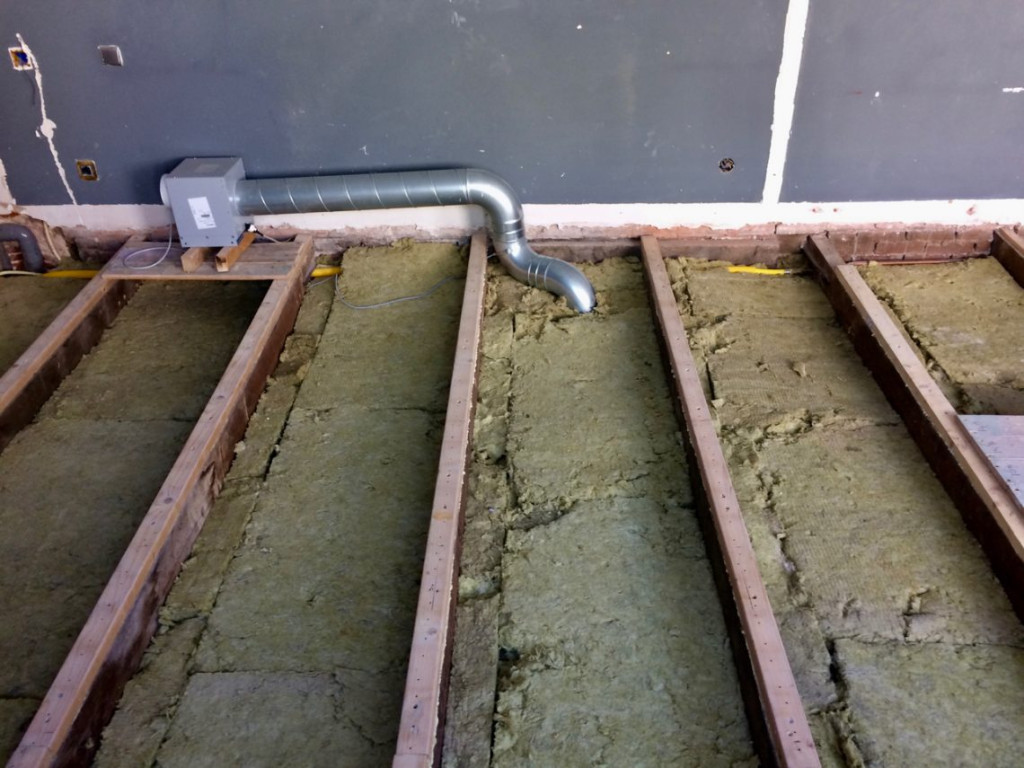 Daarna werd het een vies werkje. Alle oude Rockwool moest weer een plek krijgen. Het moet overal zo goed mogelijk aansluiten, anders kun je later toch nog een “geluidslek” krijgen. Het was een enorme puzzel. Ik leek wel een acrobaat. Tot vanmorgen kon je gewoon tussen de balken op het plafond lopen, maar dat was niet meer mogelijk zodra er Rockwool lag. Dat zou je dan kapot trappen. Ik moest nu dus over de balken balanceren, met in mijn handen een plaat stoffige en ontzettend jeukend Isolatie.  Uiteindelijk, een paar liter gezond werkmanszweet later, waren alle vakken tussen de balken met een dubbele laag isolatiemateriaal ingevuld.