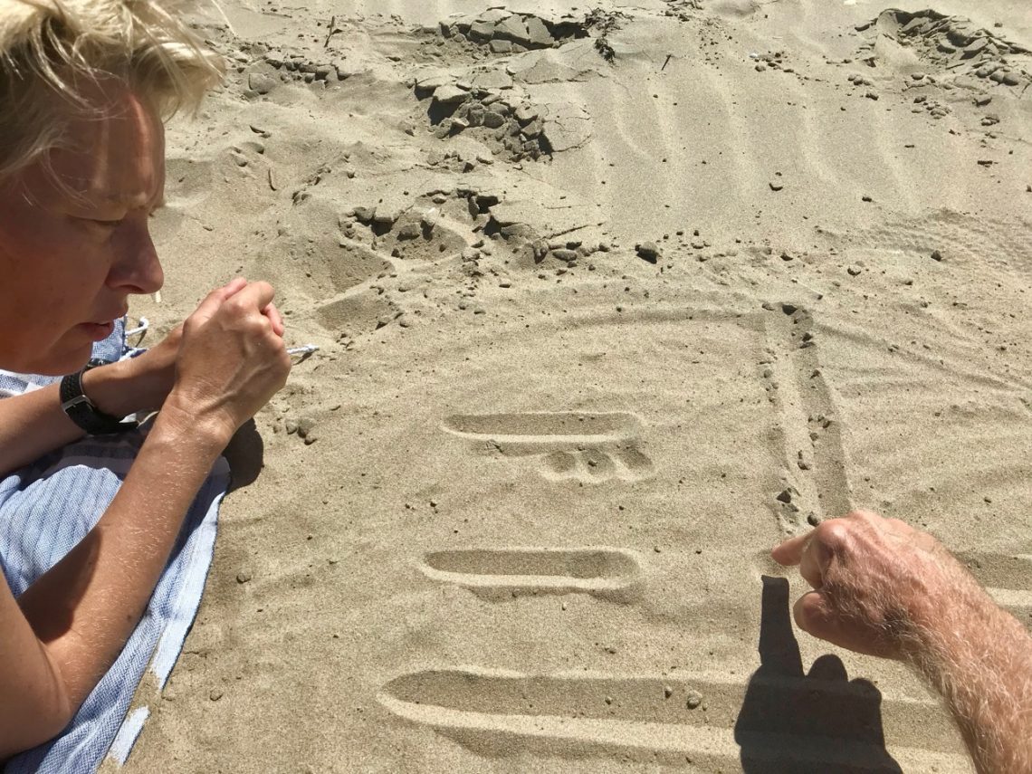 Lagen we eindelijk lekker in de zon, bleek er een vergadering te zijn. Ik moest even switchen in mijn hoofd. Hessel tekende de keuken, de gang en de trap in het zand en we moesten bespreken waar de lichtknopjes zouden komen. Zodra het plafond erin zit kunnen we niet meer terug.