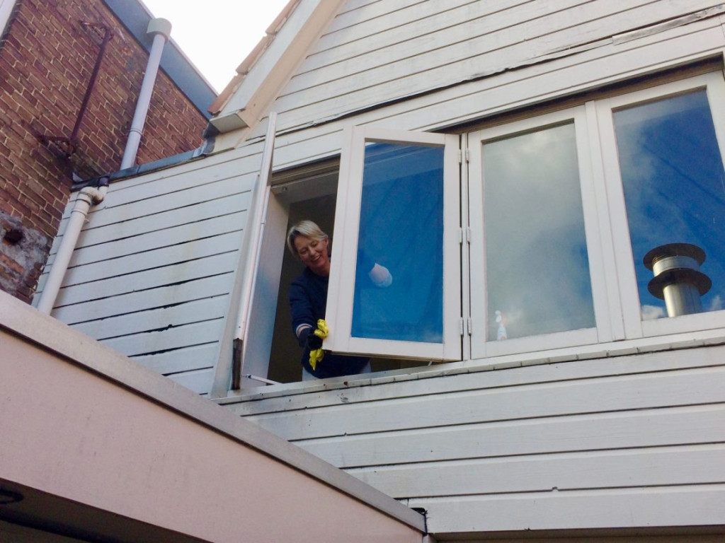 Toen ik klaar was met het weghalen van het vuil van het bovenhuis ging ik eerst de bovenverdieping weer schoonmaken. Dit is niet omdat ik smetvrees heb, maar omdat de mannen met hele vieze voeten van het dak heen en weer hadden gelopen. Dus alle modder lag feitelijk overal, gemixt met zaagsel en andere troep die je krijgt als je hard aan het werk bent. Nu zijn Hessel en ik is sommige opzichten echt gelijk aan elkaar: het moet eerst weer schoon voordat we verder kunnen.