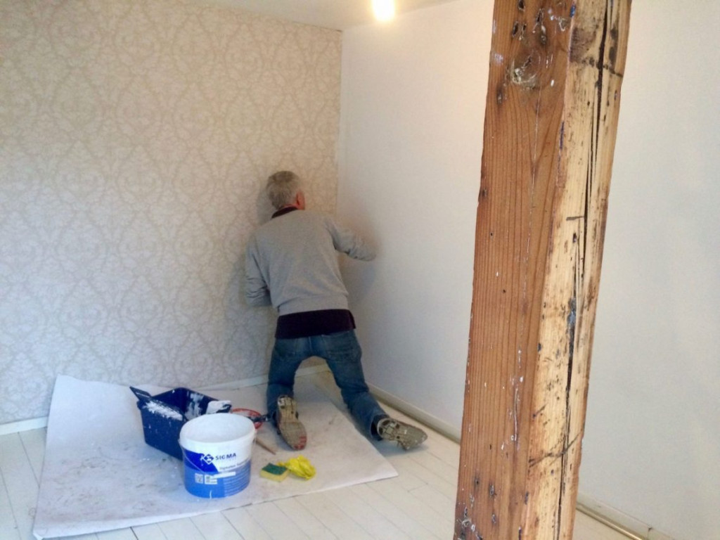 Nadat de kamer schoon was, ging het latexen beginnen. Ik vond dat nog best moeilijk, om het gelijk dekkend te krijgen en ook vrij zwaar om te doen. Gelukkig deed Hessel even de moeilijke randjes, zoals bij het behangetje -dat we willen laten zitten.