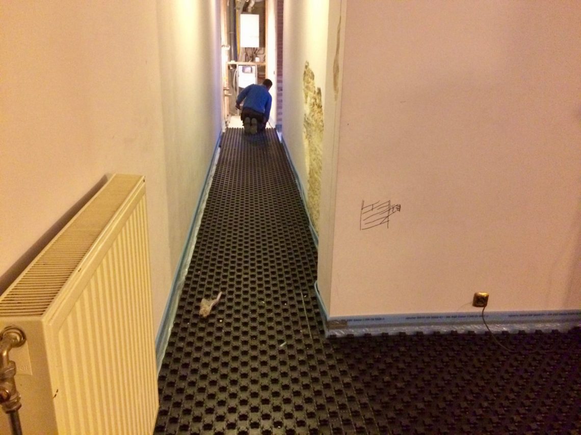 Rond half elf was dat zover, en werden de eerste noppenplaten geplaatst. Door die noppen worden morgen de verwarmingsbuizen gevlochten.