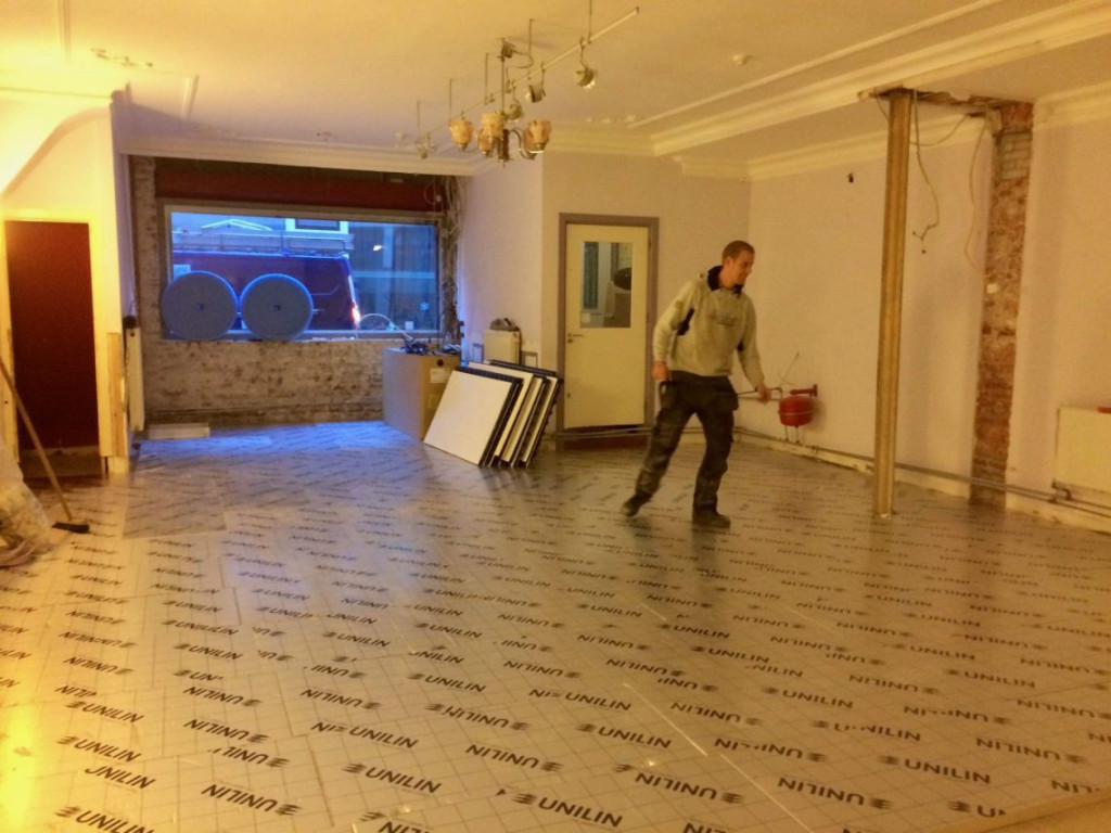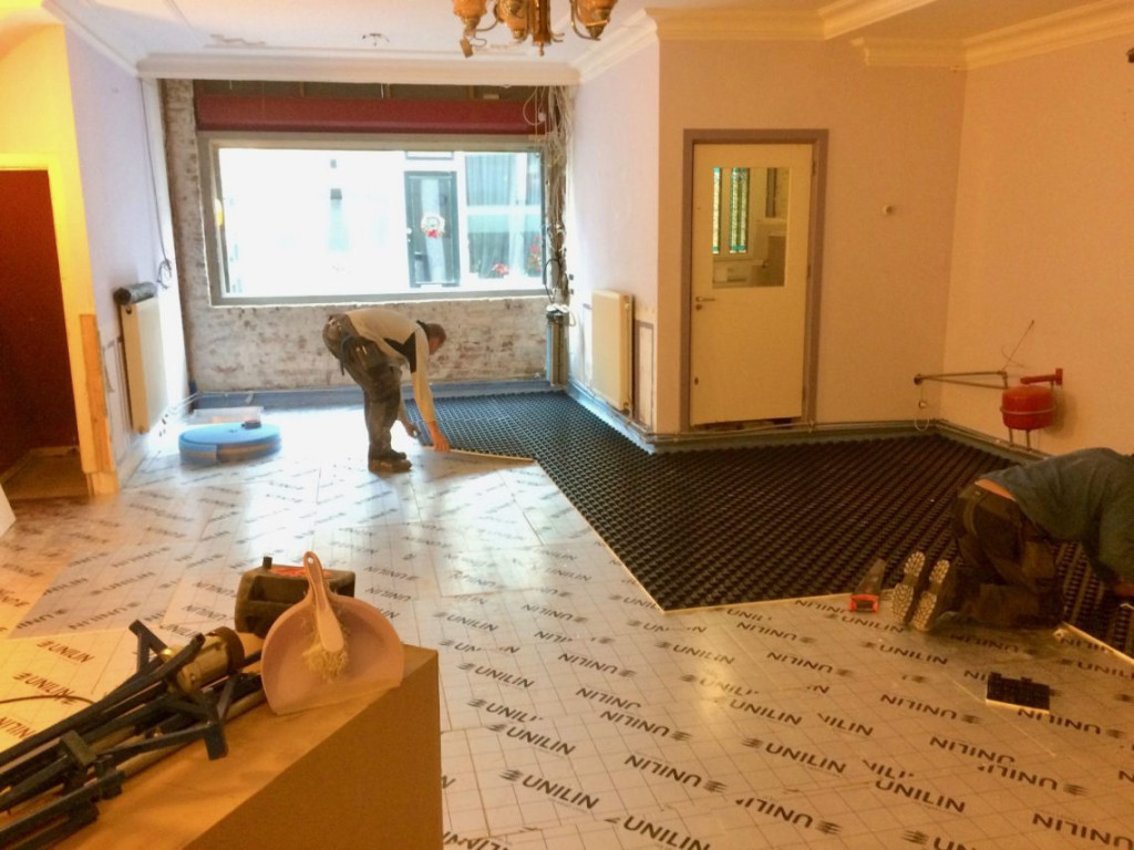 Rond half elf was dat zover, en werden de eerste noppenplaten geplaatst. Door die noppen worden morgen de verwarmingsbuizen gevlochten.