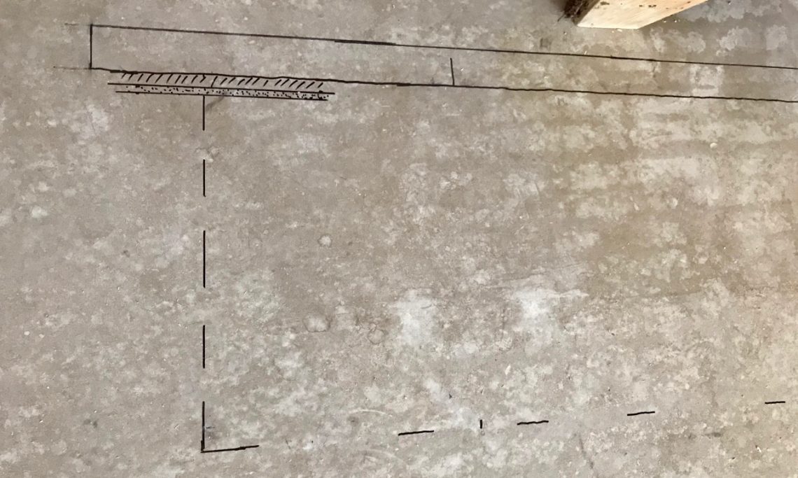 Omdat ik toch lekker bezig was, kon ik net zo goed weer even tijdelijk een muurtje bouwen. Om te kijken hoe alles zou “voelen”. Ik had nog oude multiplex platen, die plaatste ik precies op de lijntjes op de vloer.