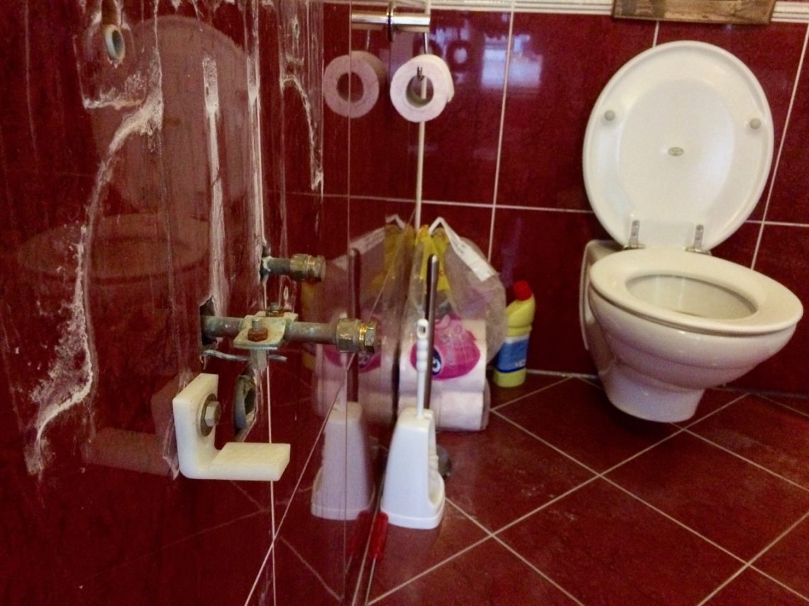 Ik vond het best lollig. De badkamer bleek groter dan ik vermoedde, je kunt gewoon je tanden poetsen zonder met je gat in het urinoir te steken, en de WC staat best gezellig beschut zo vlak om de hoek van de deur.