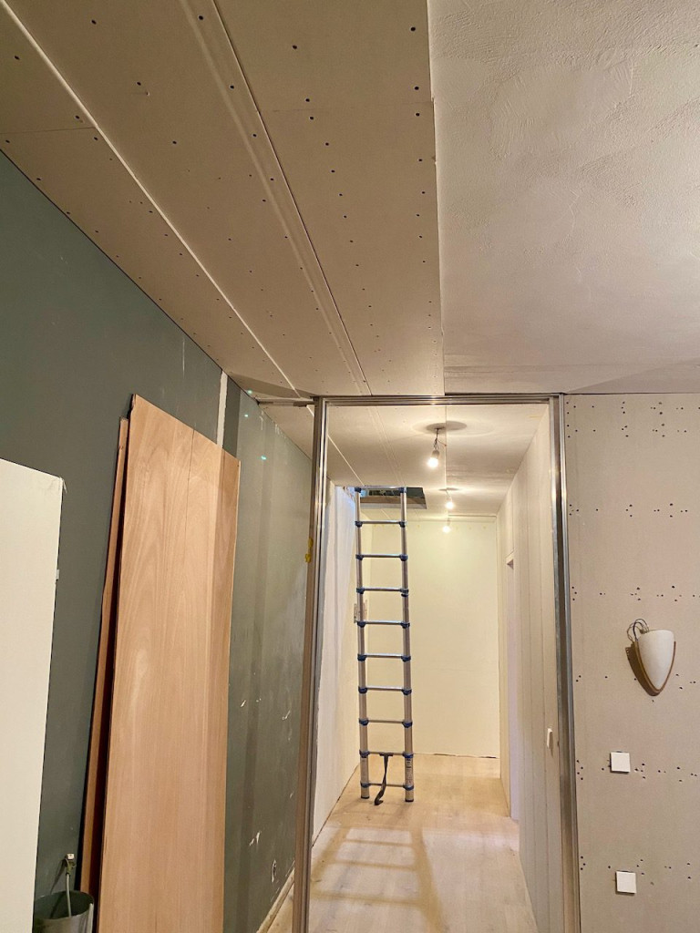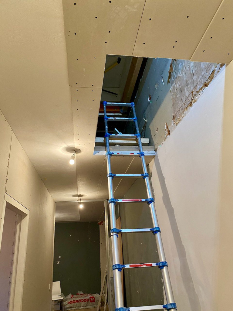 Hessel had niet alleen de plafonds met extra gipsplaten horizontaal gemaakt, maar ook de zijkanten van het trapgat afgewerkt.