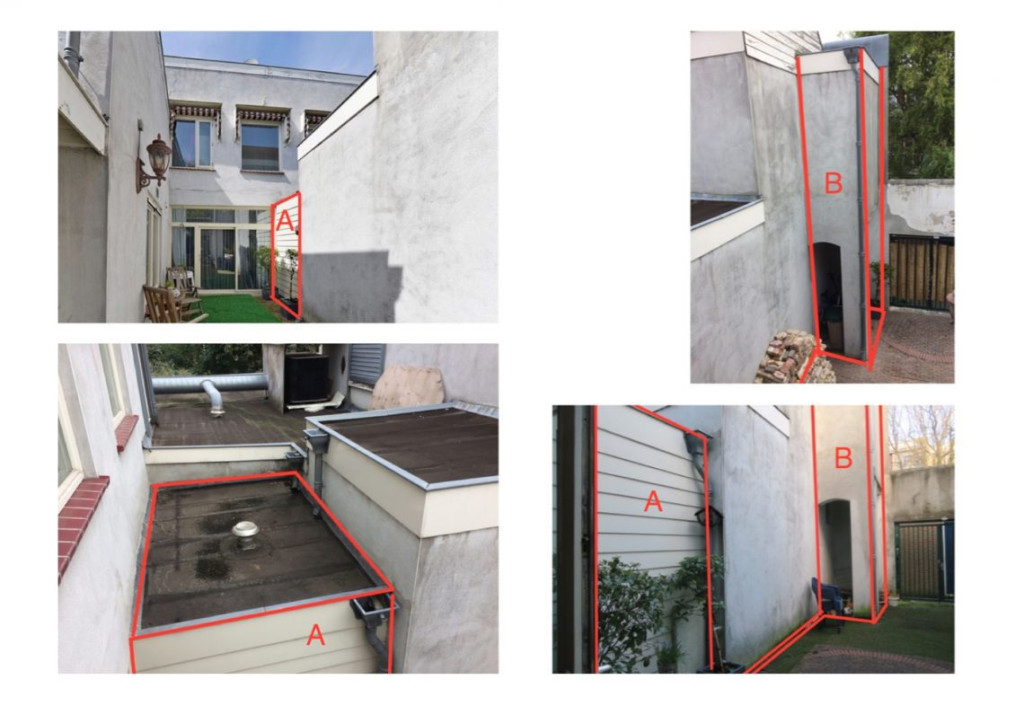Het perceeltje bestaat uit twee delen. Een stukje wat we “A” noemen, met daar aan vast een heel dun sliertje grond wat de verbinding vormt met stukje “B”. Op stukje A staat nu een soort schuurtje. Het is door het theater in gebruik als ontmoetingskamertje. Stukje B hangt als het ware boven onze tuin. Wij kunnen op de grond van B rondlopen, maar op een grote kolom rust daarboven een deel van de eerste etage van het theater.