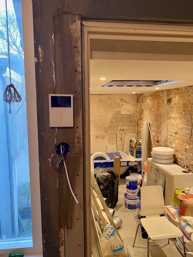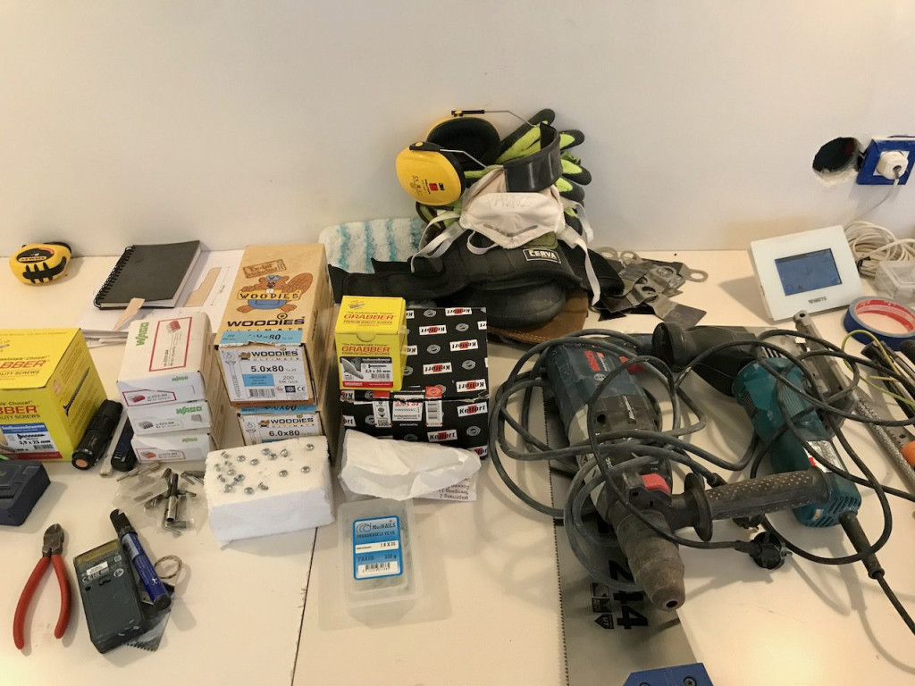 Ondertussen was Hessel gewoon bezig met leidingen trekken en bijvoorbeeld met het maken van de leidingen en de knopjes van de buitendeur en zonnewering bij de badkamerdeur.