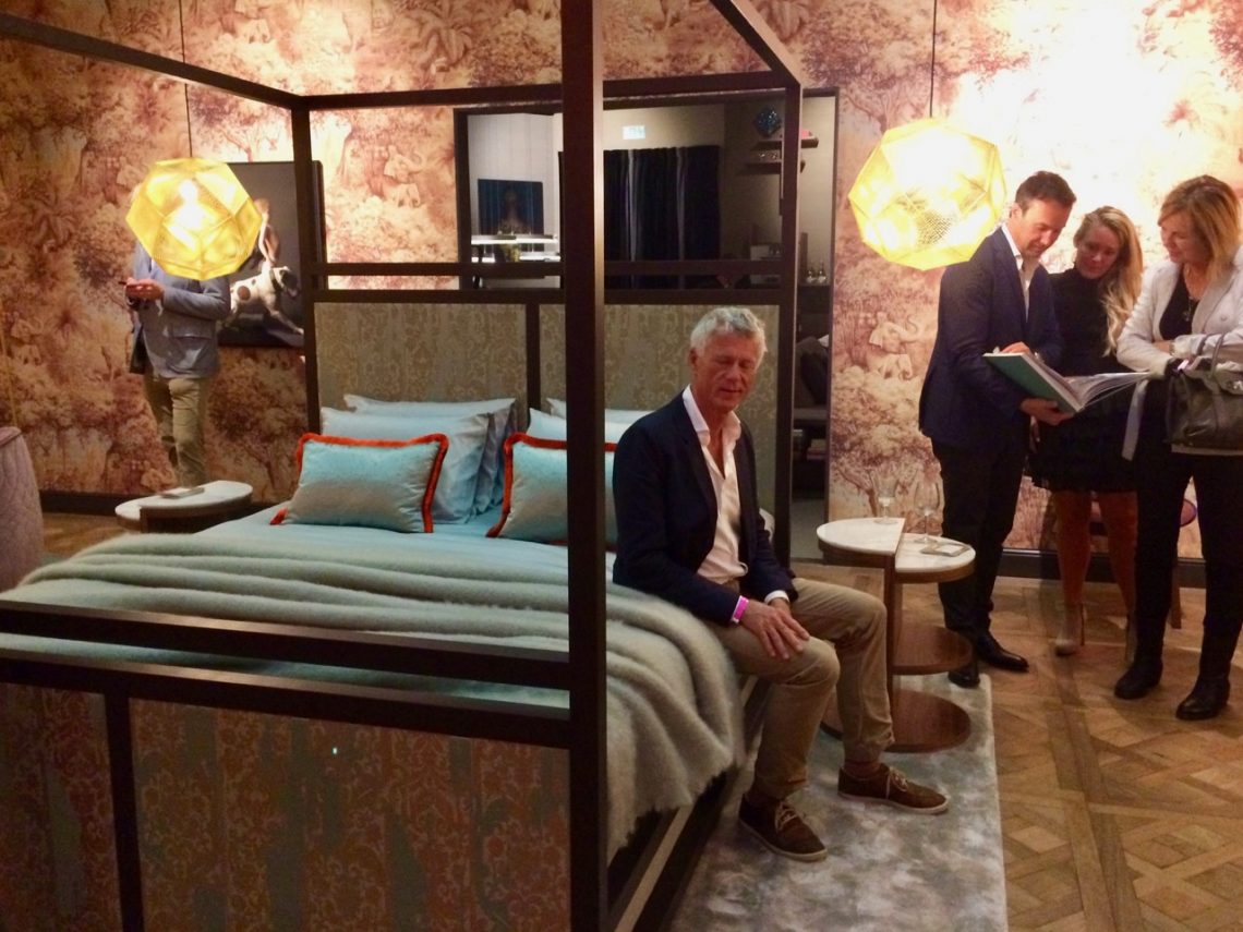 Tot we in een fijne kamer kwamen. Daar voelde het meteen helemaal goed. Ik keek op een bordje bij de ingang en ja hoor: het was de showroom van Stock Interiors. Jeroen Stock kwam meteen op ons af om even bij te praten. Midden in de kamer stond het bed dat zij zelf ontworpen hadden. Je zou er zo in willen gaan liggen. Je ziet trouwens het bed in de hoofdfoto van dit bericht, rechtsboven zie je Jeroen Stock en in het midden zie je Hessel die nog steeds op z’n paasbest en licht geparfumeerd is, maar van vermoeidheid al heel wat minder parmantig.