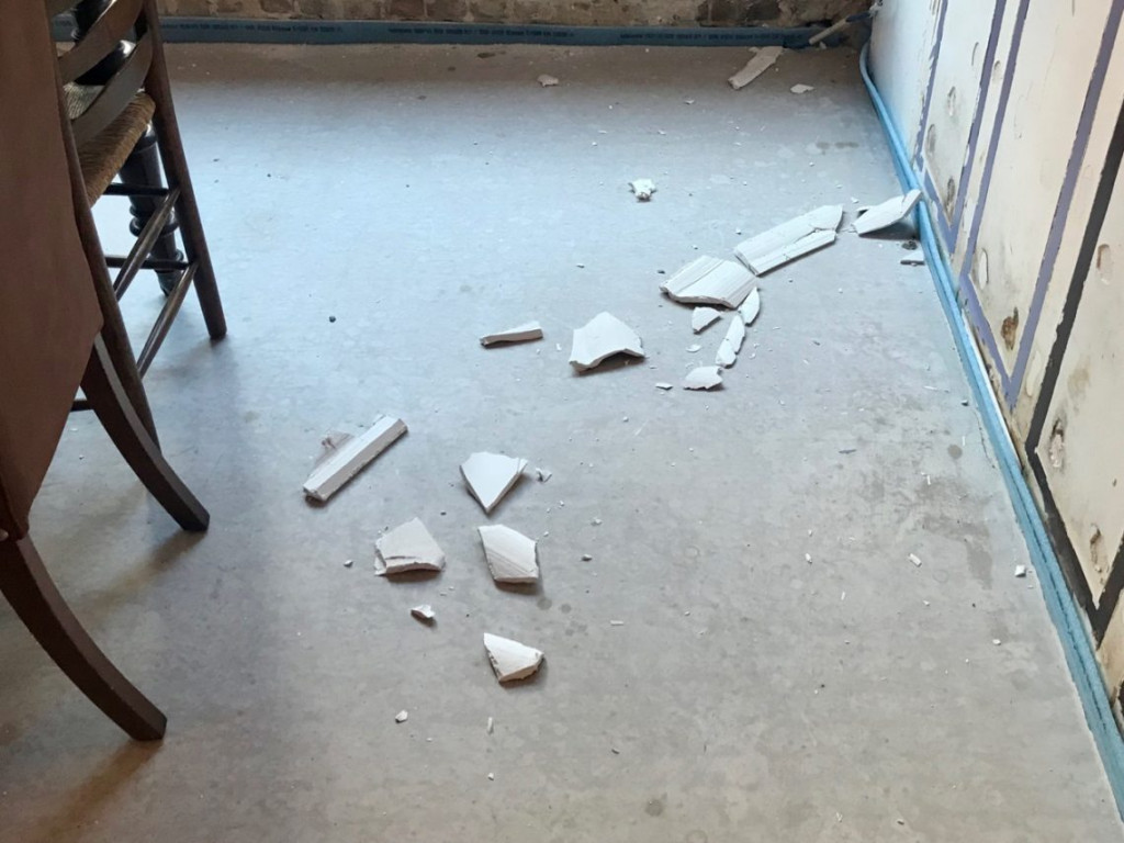 Aangekomen zagen we een stuk van de rand van het plafond- die al los hing- uit verveling toch naar beneden is gevallen. Soit. Niets aan te doen, dat komt tzt wel goed.