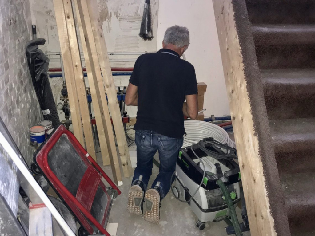 Daarna kroop Hessel in onze ‘machine kamer’ om de hendels van de badkamer te vinden. Hij belde even met Bart de loodgieter en zette ze toen aan.