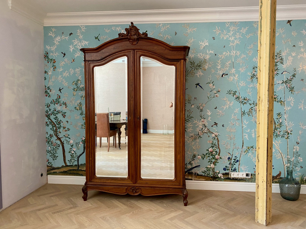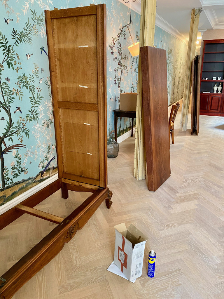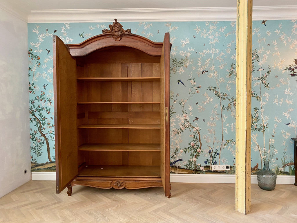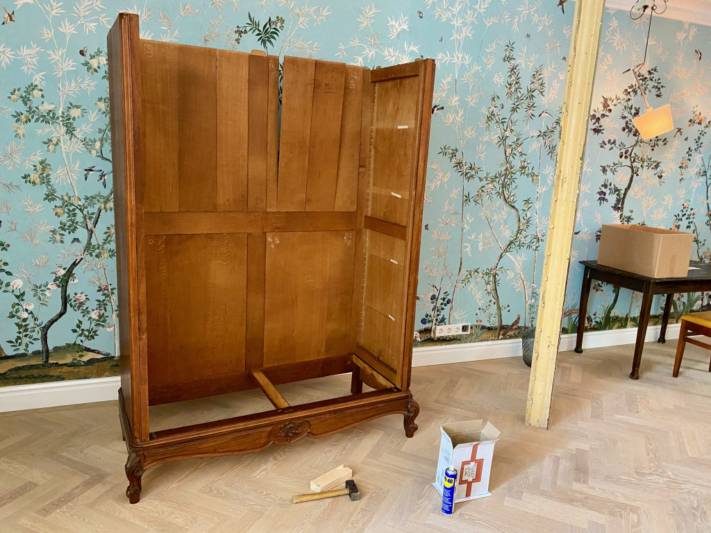 Annie had op de site van “De Oprechte Veiling” bij ons in Haarlem zitten kijken. Daar had ze een bijzonder mooie linnenkast gezien. Vanwege de Corona werd de veiling online gehouden. De avond van de veiling had ik niks beters te doen, ik klikte op wat knopjes op mijn iPad en waarachtig, we hadden voor een appel en een ei een kast gekocht. Biedermeier volgens de veiling, maar het zou ook Louis XV kunnen zijn. Daar studeren we nog op.