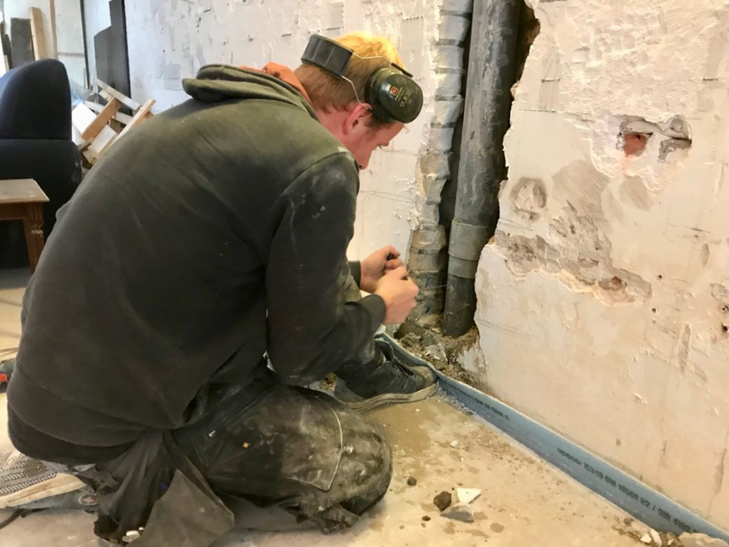 Met de bikhamer heb ik ruimte voor Dokter Bart gemaakt. Toen de meeste stenen weg waren kon ik met mijn hand achter de pijp voelen. Daar stroomde water! Niet een beetje vochtig, nee, echt stromend water. Van de regenbui die net gevallen was. Oeps, geen wonder dat de muur vochtig was. Bart zaagde met een soort Kaaszaagje de buis boven en onder de wond door.