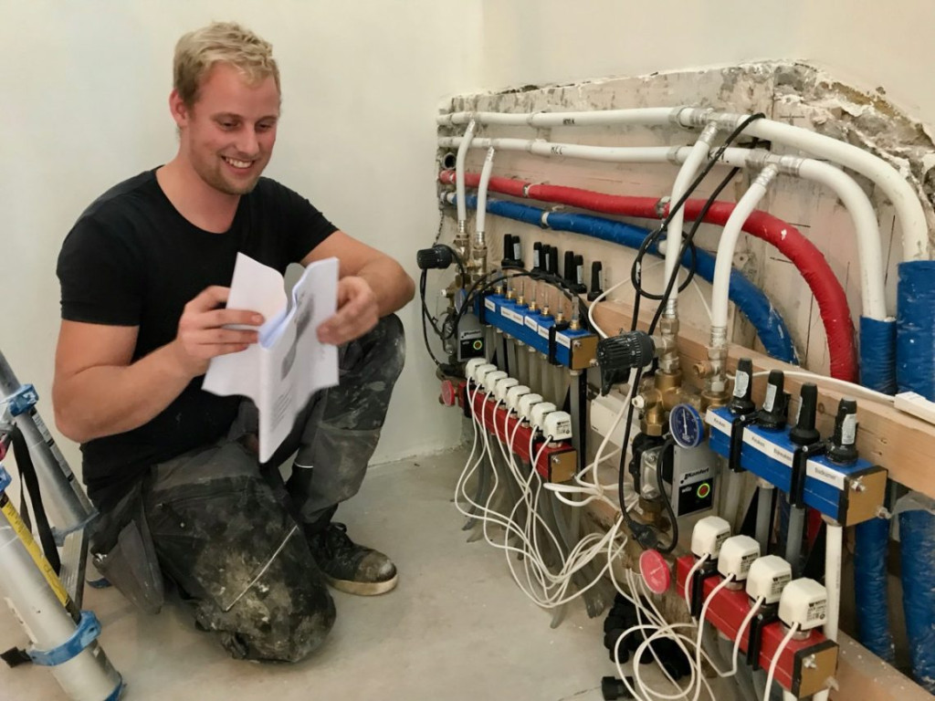 De volgend specialist stond vanochtend al klaar. Bart Lascaris, voor al uw installatiewerken. Bart had een complete regelunit bij zich voor onze verwarmingshoek. Dat is toevallig ook onze trappenhoek, dus de vliegtuigtrap kon uitgeparkeerd blijven. Elke groep van de vloerverwarming heeft nu zijn eigen motortje. Die worden vanuit de verschillende ruimtes aangestuurd. Zo hebben we nu een aparte regeling voor de woonkamer, de keuken, de badkamer en de twee slaapkamers. Bart werd ook al zo vrolijk van zijn werk.