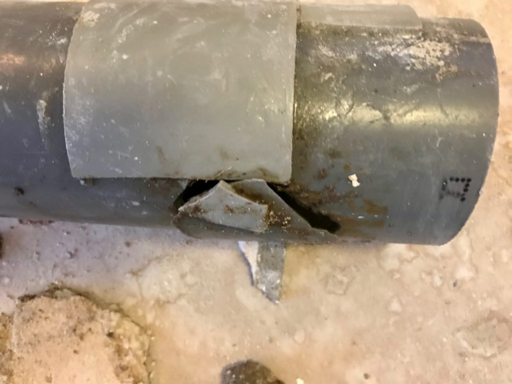 Met twee schuifmoffen en een nieuw stuk buis heeft hij toen een definitieve reparatie gemaakt. Wat bleek? Toen hij ooit een tijdelijk stukje buis op het gat gelijmd had, heeft hij zonder het te weten aan de achterkant van de buis een flapje gescheurd plastic opengeduwd.