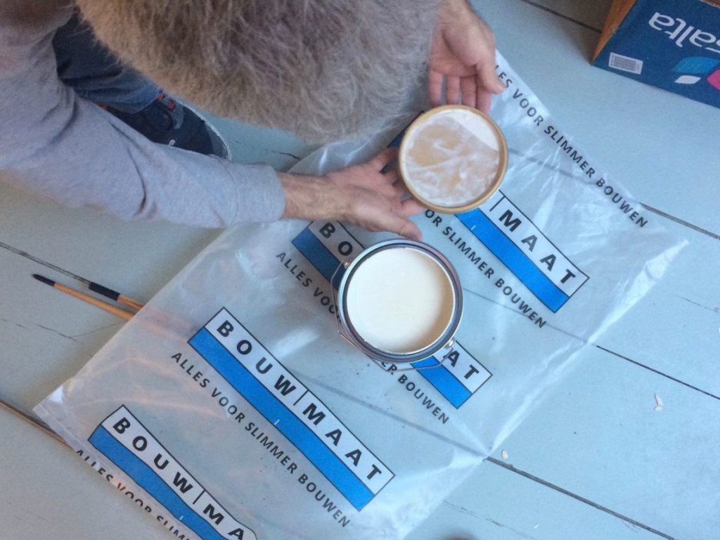 We waren vandaag iets later, wegens een heel leuk etentje met Bert en Joan gisteren in Amsterdam. Maar toen we er eenmaal waren, gaven we ook plankgas. Hessel ging boven het houtwerk doen. Te beginnen bij de ramen achter. Zoals je hebt kunnen zien op de andere foto’s zit er nogal wat houtwerk in het huis qua dwarsbalken etc. Maar alles heeft verschillende kleuren wit, wat het een beetje goedkoop doet ogen. We vroegen ons dus af, of het zo zou kunnen zijn dat wanneer wij de muren allemaal fris wit doen en het basis houtwerk standaard gebroken wit aflakken, of dit een dermate positief effect zou hebben op de hele kamer, dat we de dwarsbalkjes in de nok konden laten voor wat ze zijn.