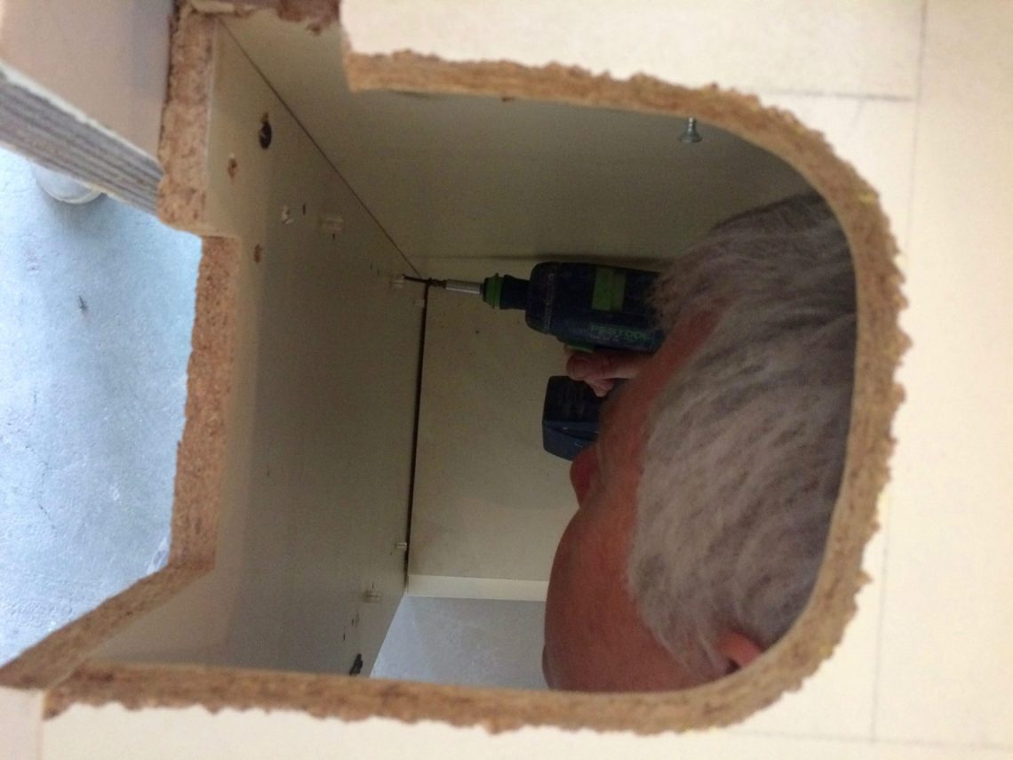 Vervolgens schoefde hij een oude deur vast op de juiste maat zodat we echt kunnen zien hoe groot het wordt. Ik ging alvast achter het fornuis staan om ‘een pan met Nespresso cupjes te koken’. Daarbij draag ik werkhandschoenen..