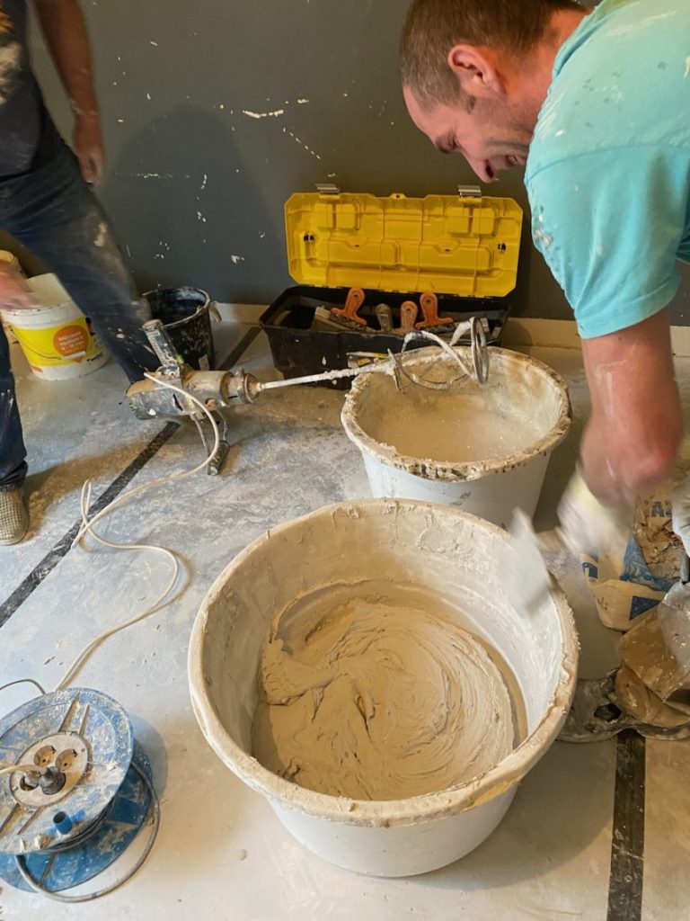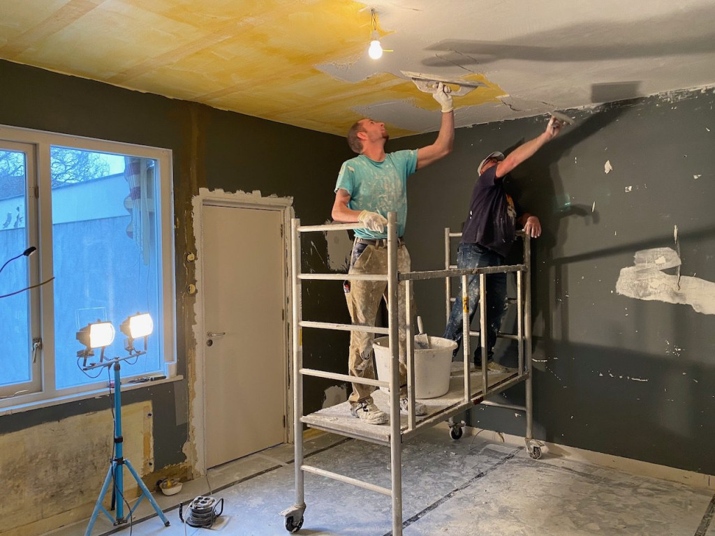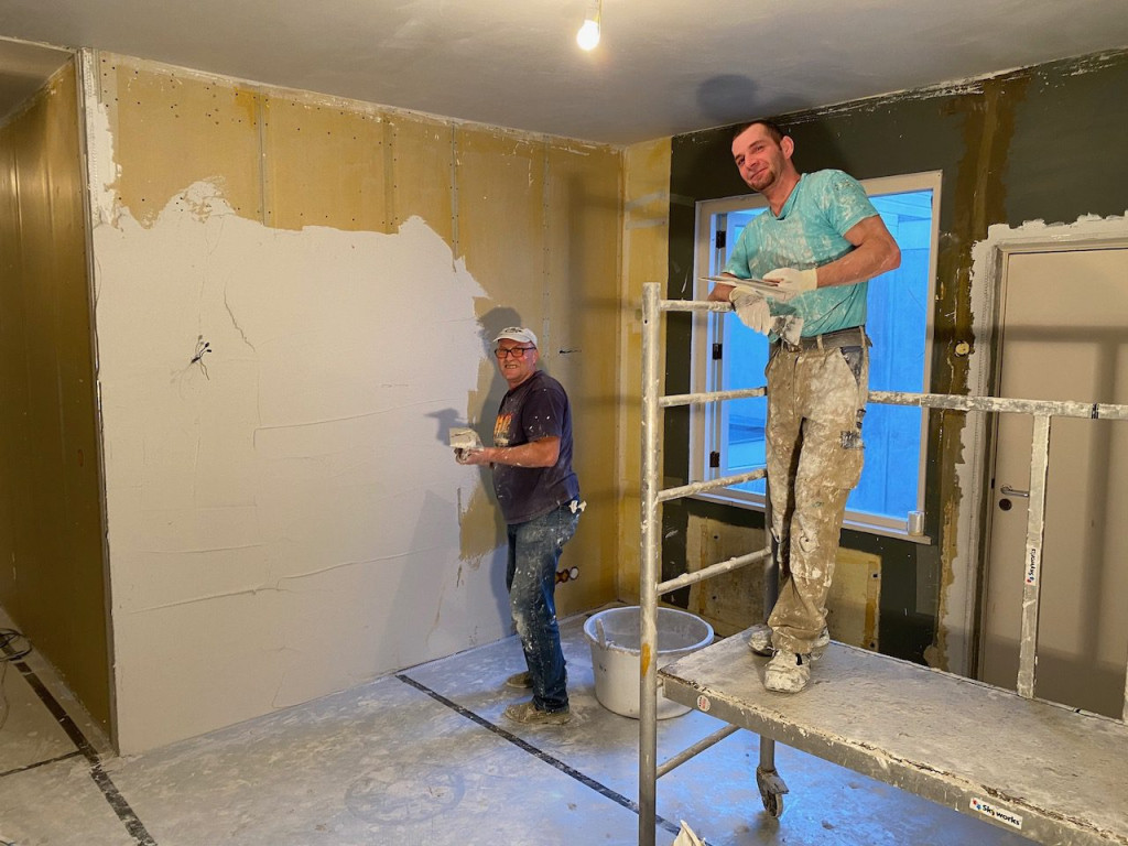 Om 13:00 lunchen ze een kwartiertje, en dan zetten ze in de middag zonder mopperen ook nog een muurtje in de stuc. Helden!