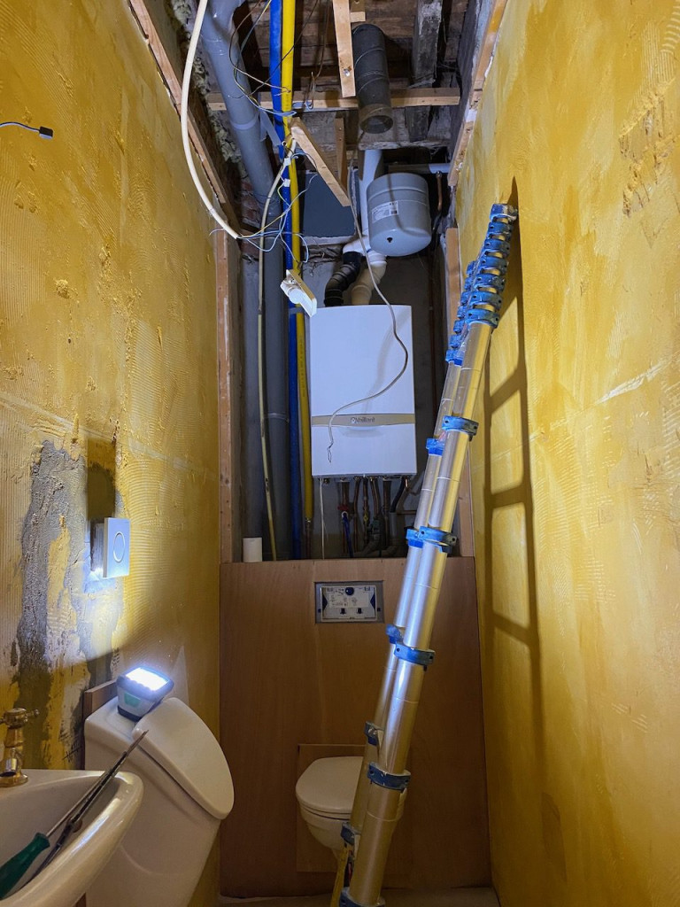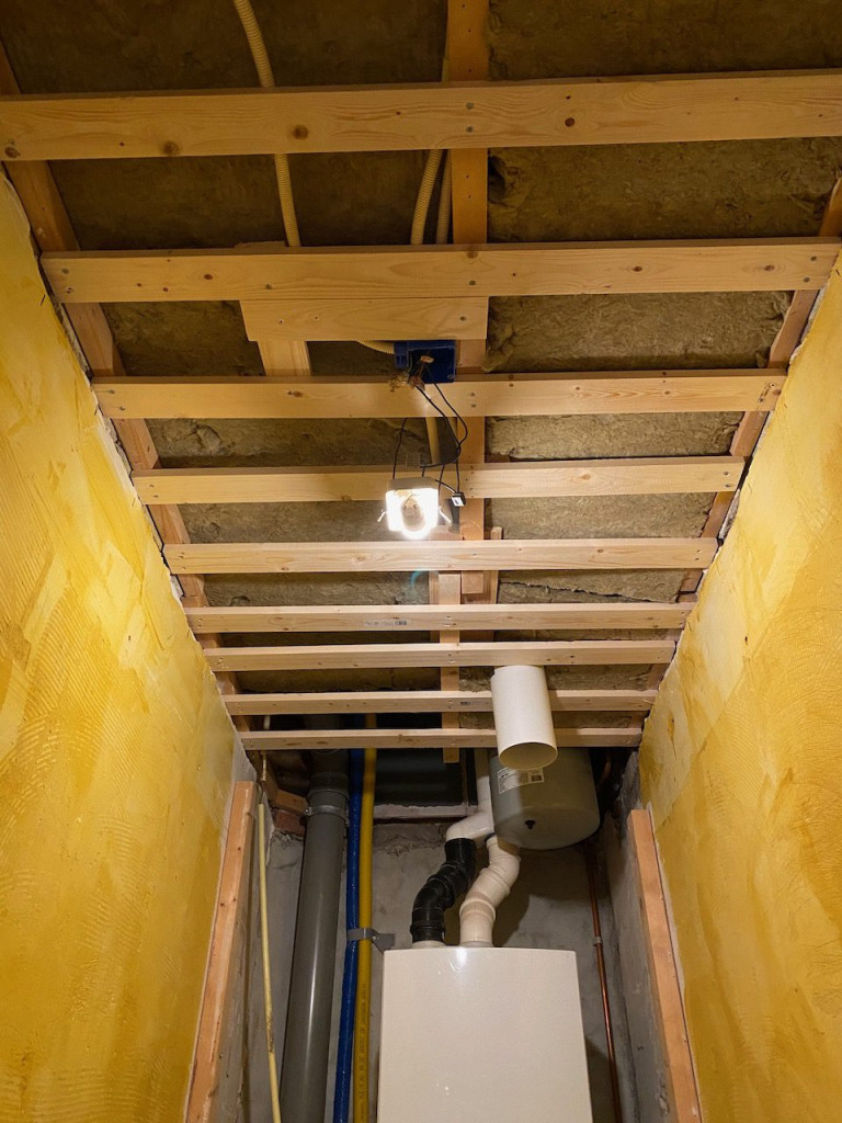 Toen de elektra op orde was, heb ik een regelwerk gebouwd, waar de gipsplaten aan komen te hangen. Ook heb ik een ventilatiepijp aangesloten.