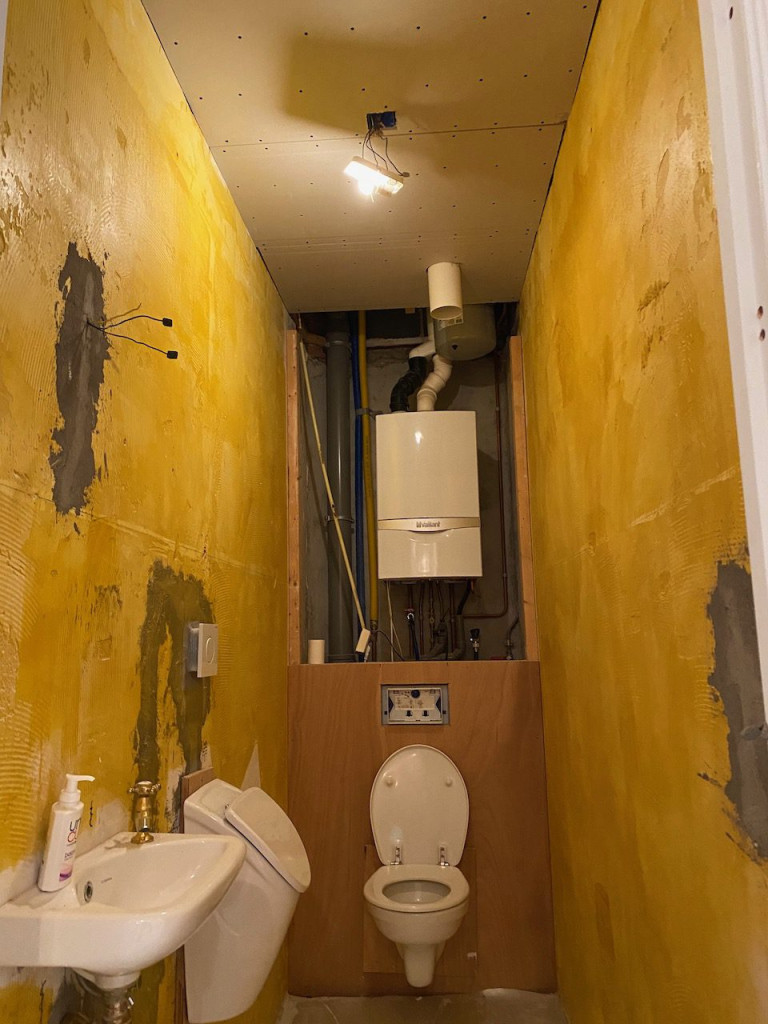 Ik heb gisteren en vandaag een plafond in onze WC gebouwd. Dan kunnen ze de hele WC ook nog even stucen voordat ze weer vertrekken.