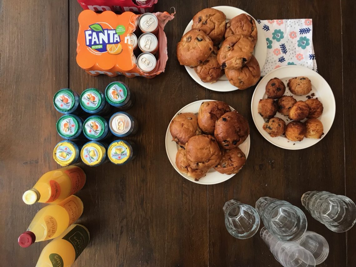 Het verzoek was of ik colaatjes en wat mini-marsjes kon serveren. Ze zouden 20 minuten blijven. Ik heb geen idee hoeveel pubers eten maar ik denk altijd ‘heel veel’. Dus ik had gisteren avond al ingeslagen in de Albert Heijn en vanmorgen op het Zuidermarktje toch nog wat krentenbollen, kokosmakronen etc meenomen. In totaal hadden we 3 grote AH tassen vol. Ik was ook bang dat het hysterisch was, veel te veel en dat mijn broer daar nog wat van zou zeggen. Dat het too much was. Maar ja, te weinig is ook niet goed en veel eten staat in mijn systeem gelijk aan “gezellig”.