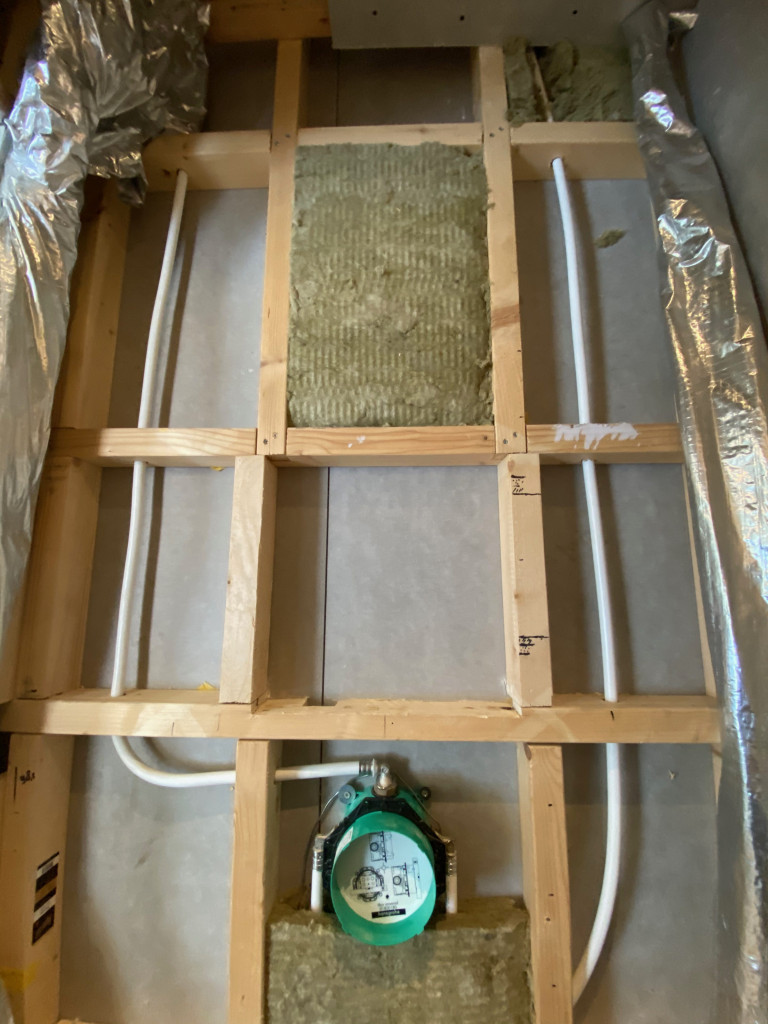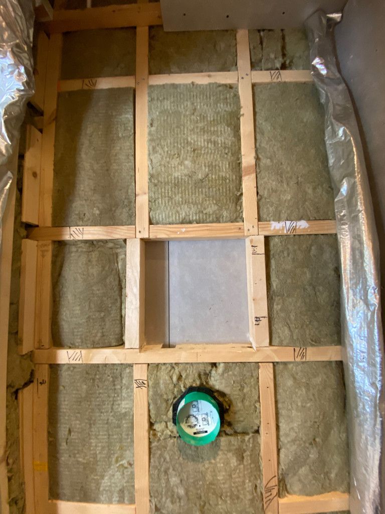 Eerst heb ik alle vakken in het houten geraamte met Rockwool gevuld. Op de plek van de groene cirkel komt straks de douche bediening, in het vakje daarboven komt de shampoo.