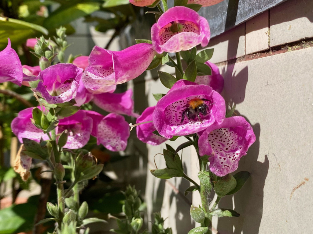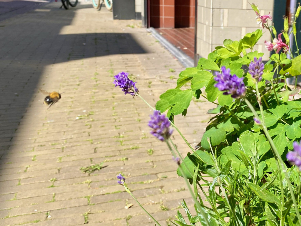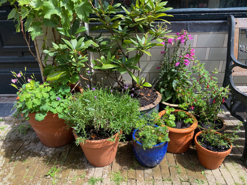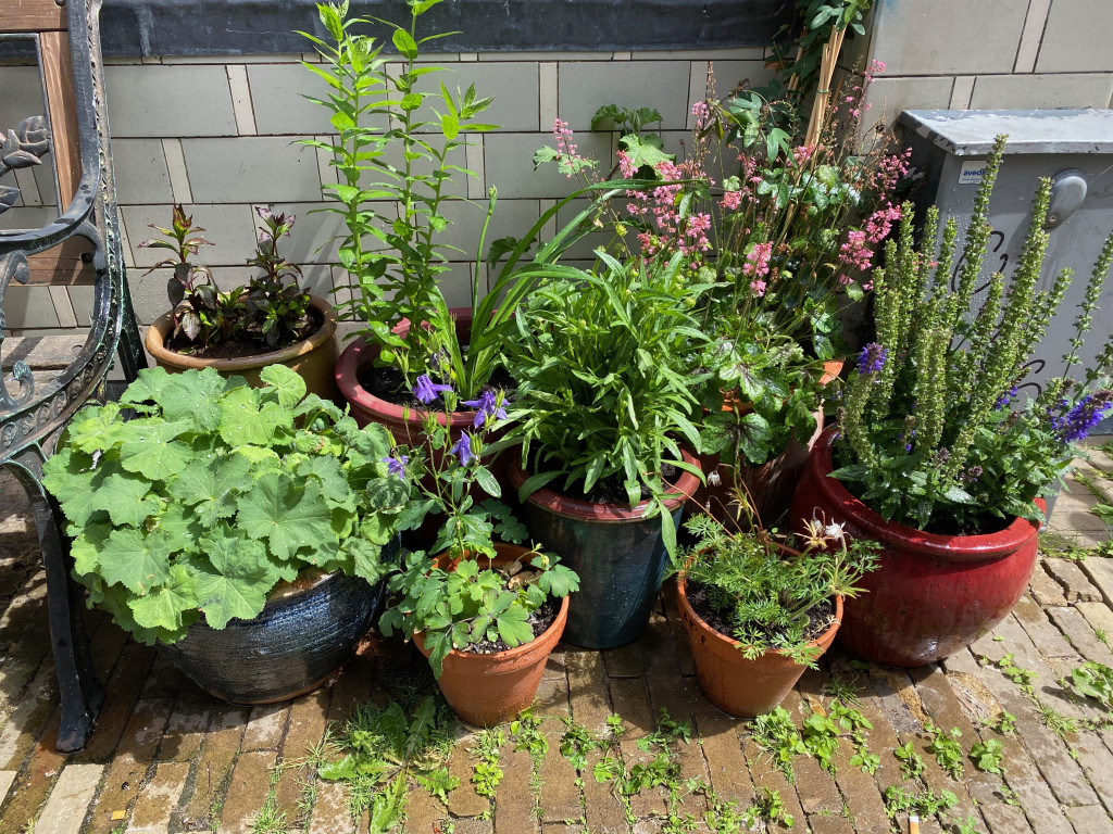 Ook de buitenboel heeft de zon in z’n kop. Ons nieuwe straattuintje heeft de buren geïnspireerd, twee overburen hebben nu ook een bankje en planten gekocht. Bij ons groeit het spul als kool, zelfs als het fuchsia’s zijn.