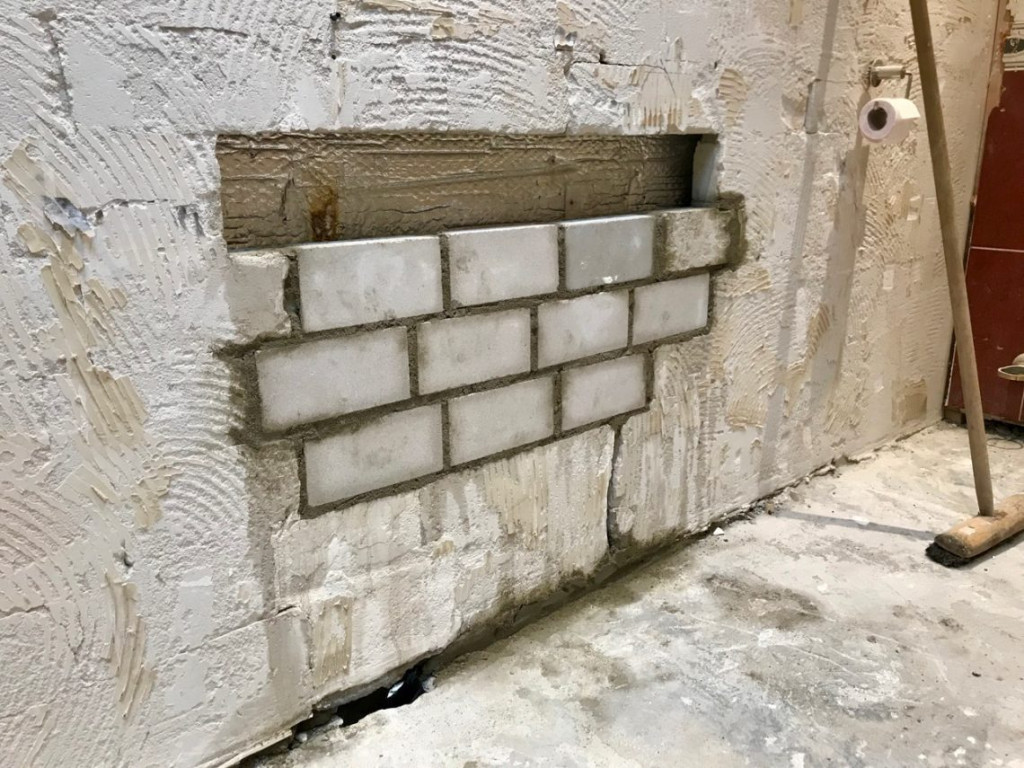 Ik had wel al eens gemetseld, maar dan lekker makkelijk. Stenen die plat op elkaar gelegd moesten worden. Maar de badkamer had vandaag een nieuwe uitdaging voor me in petto. Daar was in het verleden een extra muurtje voor de buitenmuur geplaatst. Met de stenen rechtop. Smalle kant op smalle kant. Achter dat muurtje waren waterleidingen weggewerkt. In onze nieuwe badkamer horen die leidingen daar niet te lopen. Om ze te kunnen demonteren, had ik een gat in het voorzetwondje gemaakt.