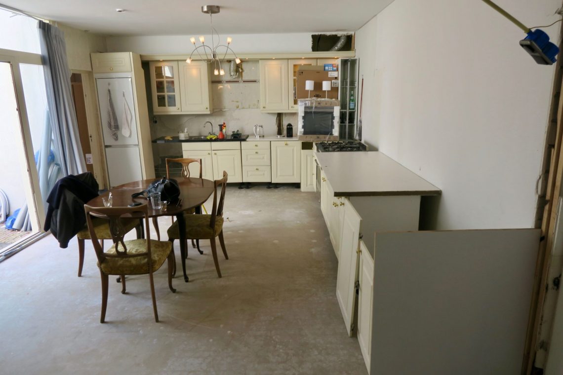 Toen demonteerden we het kookeiland en zetten dit langs de lange muur. Man, de ruimte die toen ontstond, wat zalig! Wat een fijne grote keuken hebben we toch. De tafel kan weer voor de open deuren, Hessel kan op zijn eigen plek naar buiten kijken, en ik heb meters werkblad om spullen op neer te zetten tijdens het koken. Plus tromgeroffel: geen bovenkastjes. Dat vind ik nogal heerlijk. Het is nog niet besloten dat dit het wordt, maar ik neig wel zeer naar deze optie. En Hessel ook. Hij is nu vanavond nog even goede tekeningen aan het maken, met niet een volledige kastenwand aan de korte kant, maar een halve. Hopelijk vindt Michelle van Stock dat ook goed..